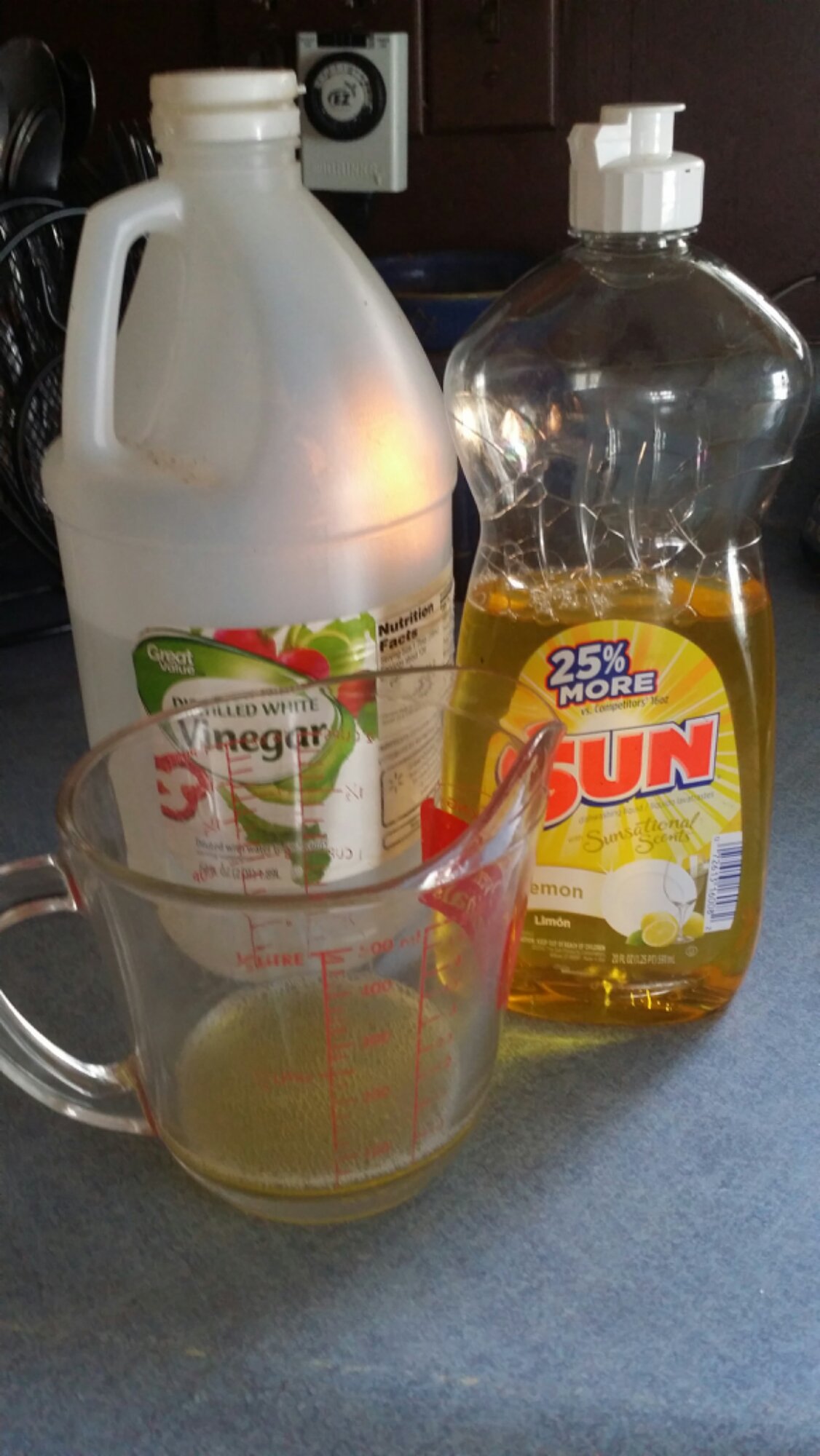 This is how you do it: heat 4 ounces of vinegar for a couple of minutes in the microwave in a glass measuring cup. Remove it from the microwave and add 3.3 ounces of dish soap to the hot vinegar. I used a plastic straw to stir it up. Now just pour most of it on your glass stove top, set your timer for 5 minutes, and when it dings come back and wipe off the stove top with a dry dish cloth. It is important to note that if you have any water on the dish cloth you will get a TON of suds! Remember to use a dry dish cloth.