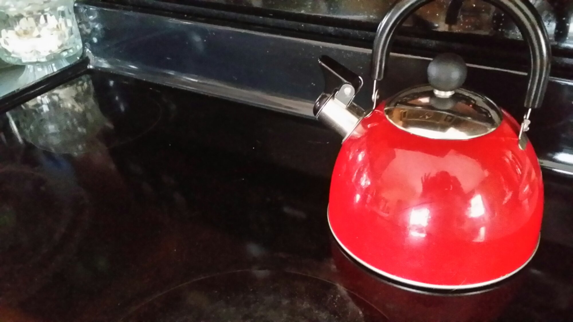 Oh my gosh! That vinegar and dish soap recipe from Pinterest really works! Those are not spots on my stove. Those are reflections on my glass top stove and little red teapot now and it was super easy to clean!