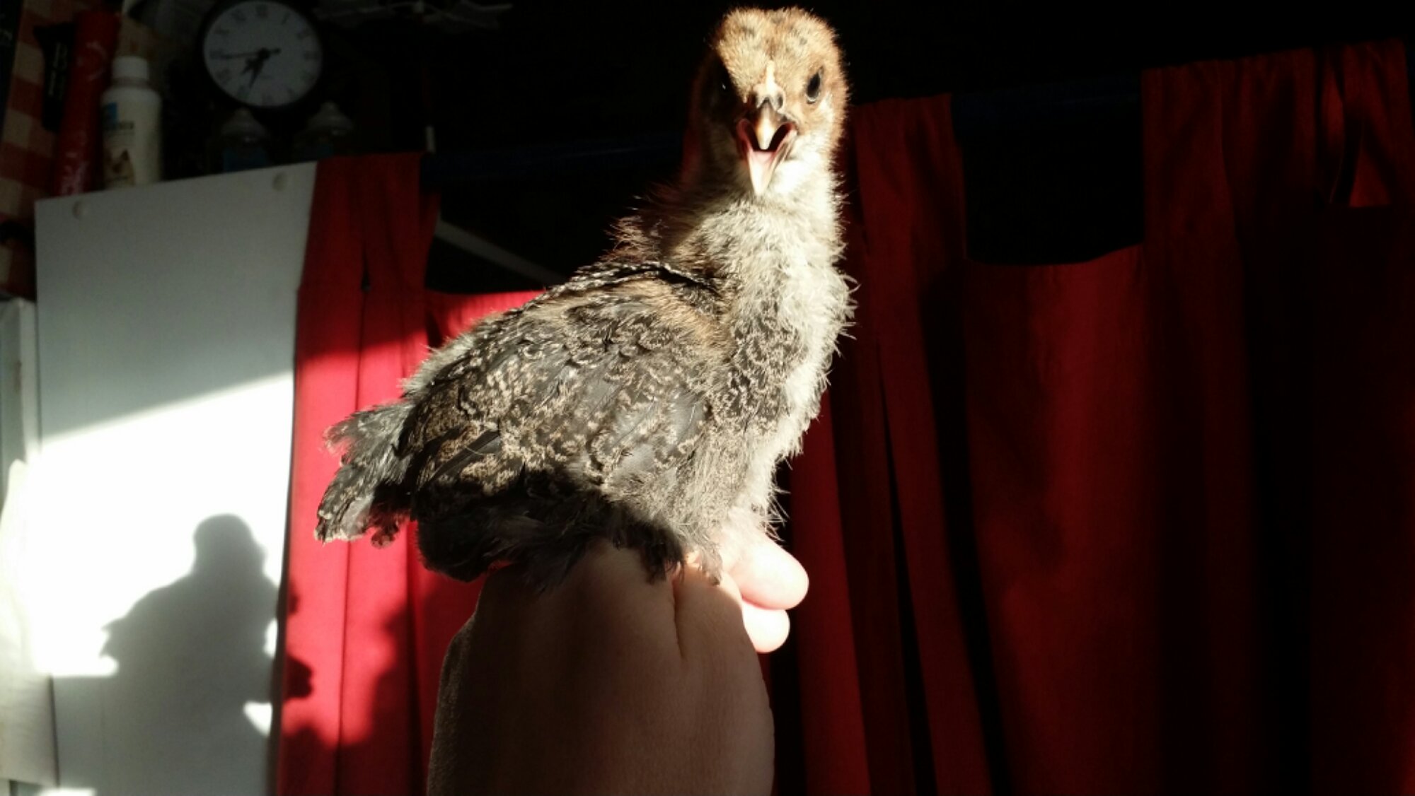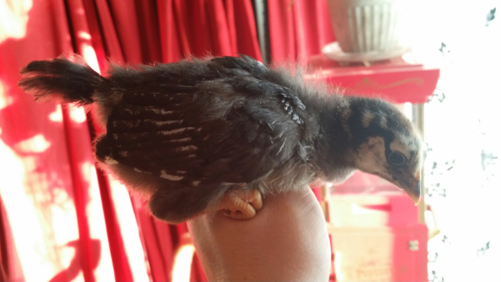 This is one of the Silver Laced Wyandottes; you can already see the black and white lace pattern on her wings. This is probably my favorite breed for looks and personality. I have an adult pair in the older flock, and they’re very sweet and though the rooster doesn’t like to be picked up, he will let me touch him and he’s very gentle and has a great disposition. The hen of this pair is equally approachable and lays a pretty little egg every other day in the nest box.