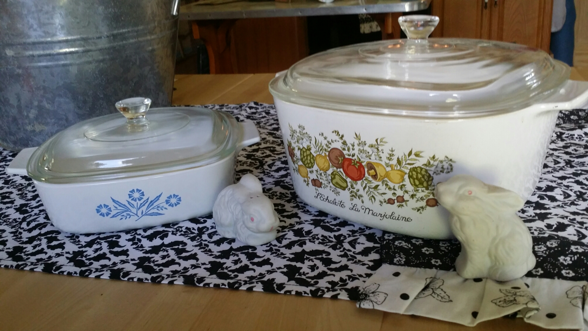 Last year, I purchased a box of Pyrex casserole lids for $1 at an auction and store them away in a box . Last weekend, I purchased these two Pyrex casserole dishes at a yard sale for $4 dollars! The lids are always the hardest things to find because they were the things that often broke the easiest out of the sets.