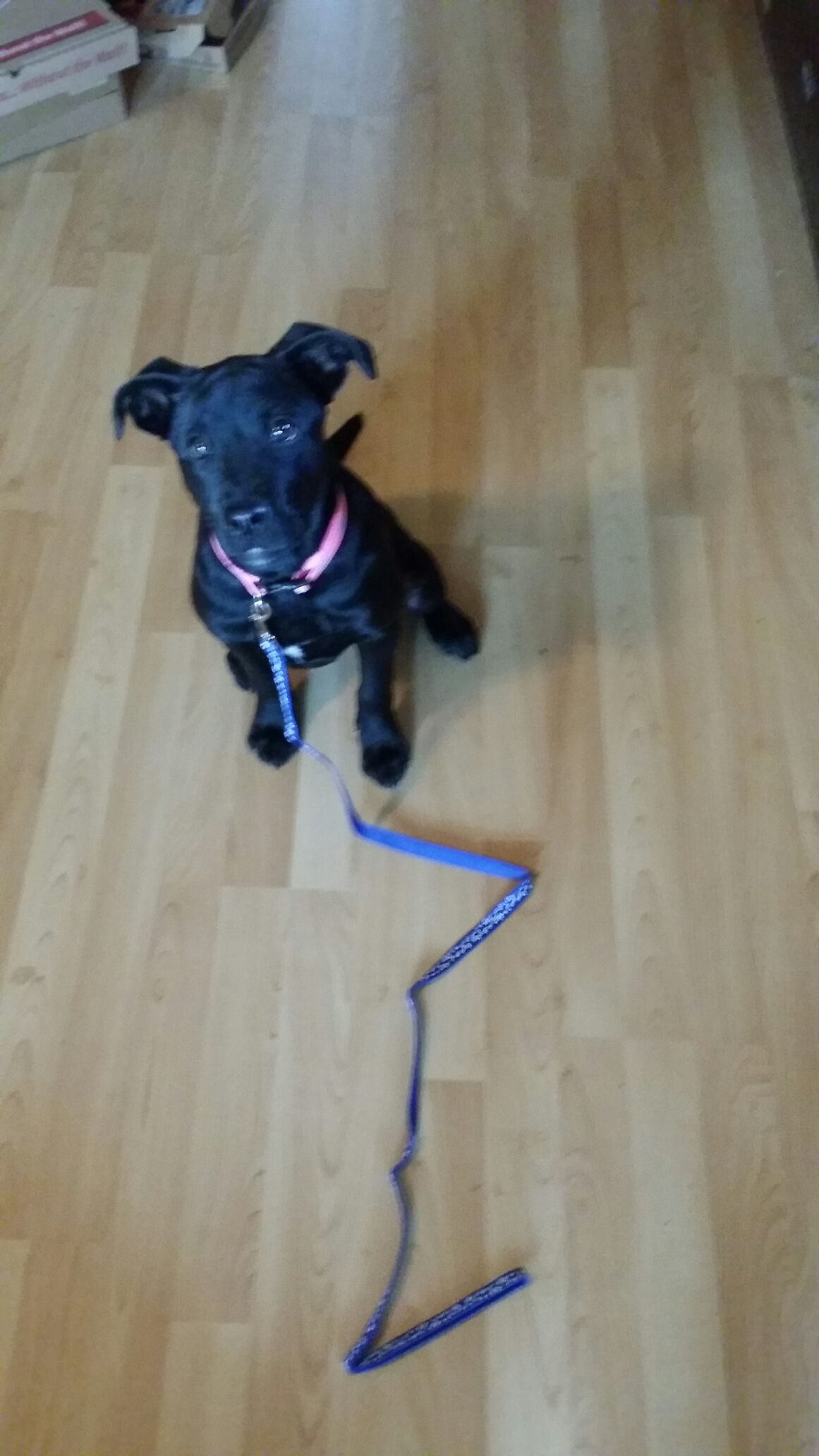 We’re starting leash training today. Puppers is nearly five months old and still won’t walk on a leash. She acts like I’m killing her when I hold the end, and she either rolls on the ground and howls (screams) like she’s dieing or just yanks backwards to try to slip the collar over her head.