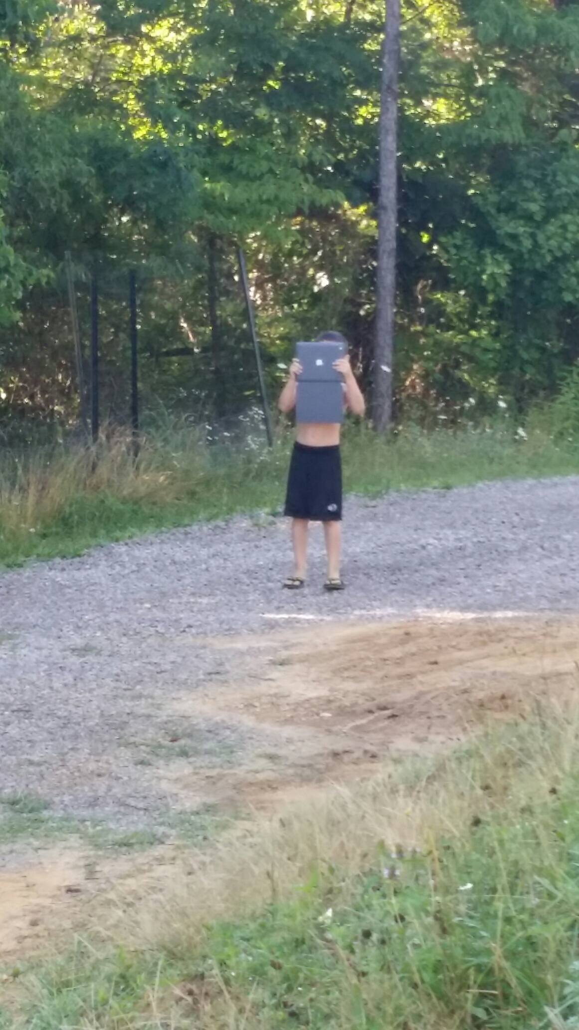 Jake’s working on recreating our little farm on Minecraft. He’s taking a picture here so he can replicate the house.