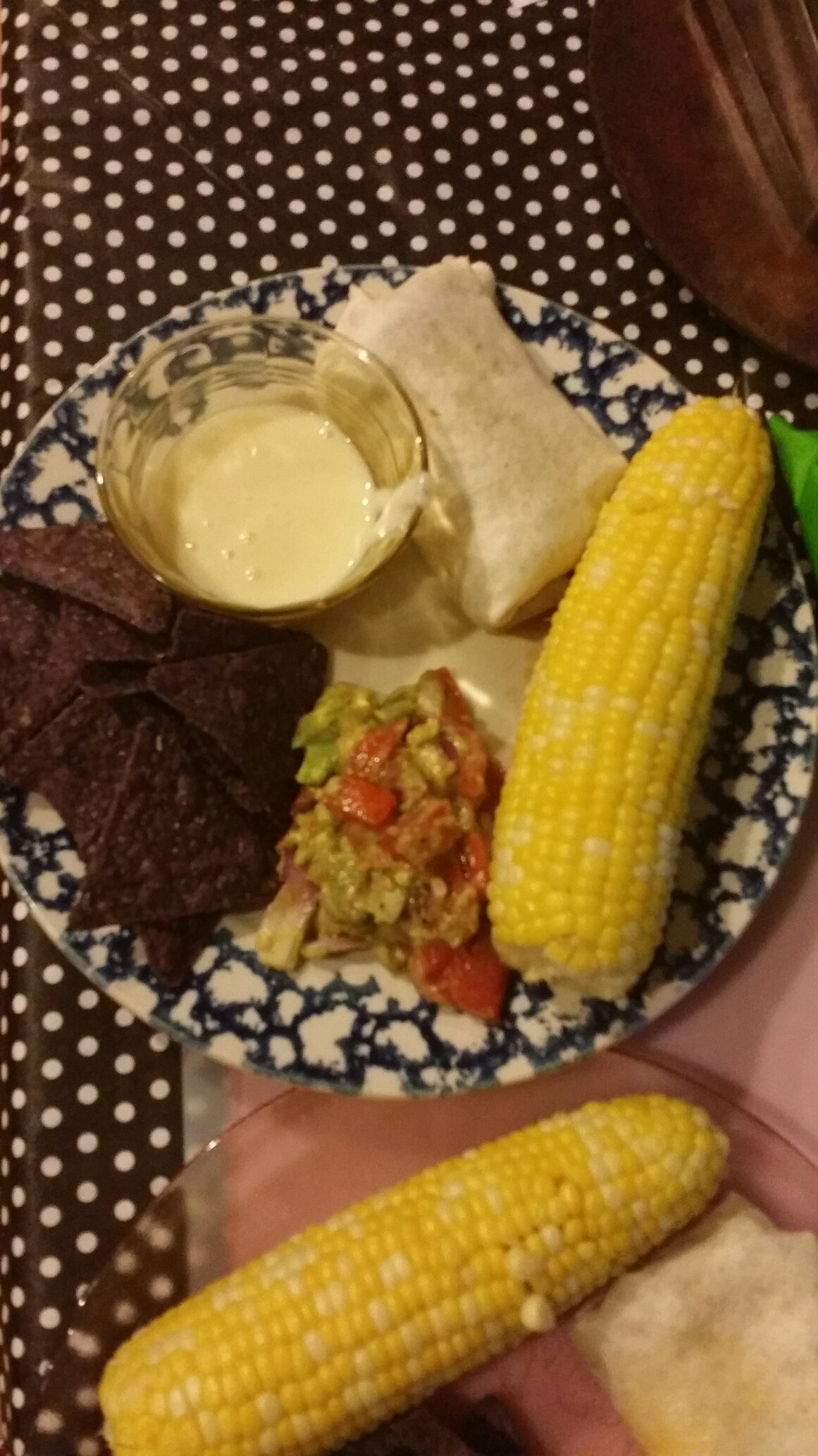 This was the whole dinner (homemade burritos, homemade cheese sauce, local sweet corn, GMO free blue nacho chips, and homemade guacamole). YUM!!!