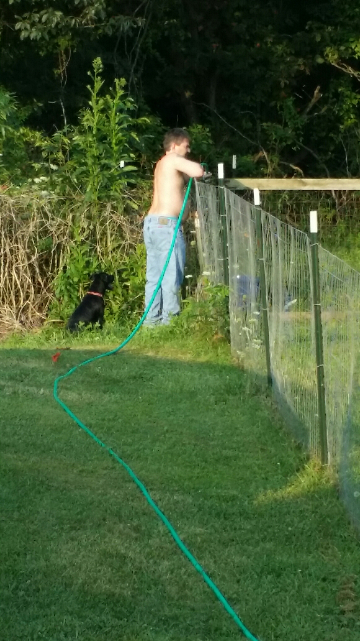 Ted brought Bessie back to the paddock in the yard. The grass has grown up in there at least 8″ tall (and some of it’s knee high) since we moved her in June.