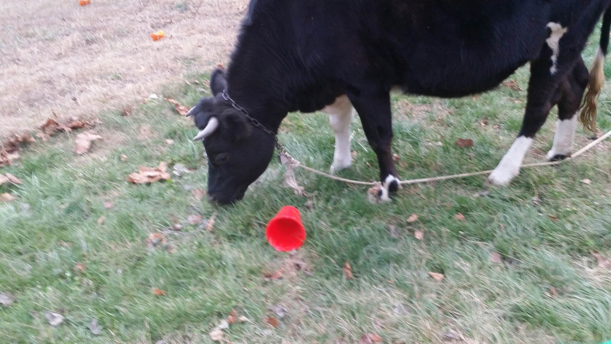 How big Bessie has gotten! That is a toy sand pail beside her face. It would just barely fit over her nose a little bit. I think she is easily upward of 1000 pounds now .