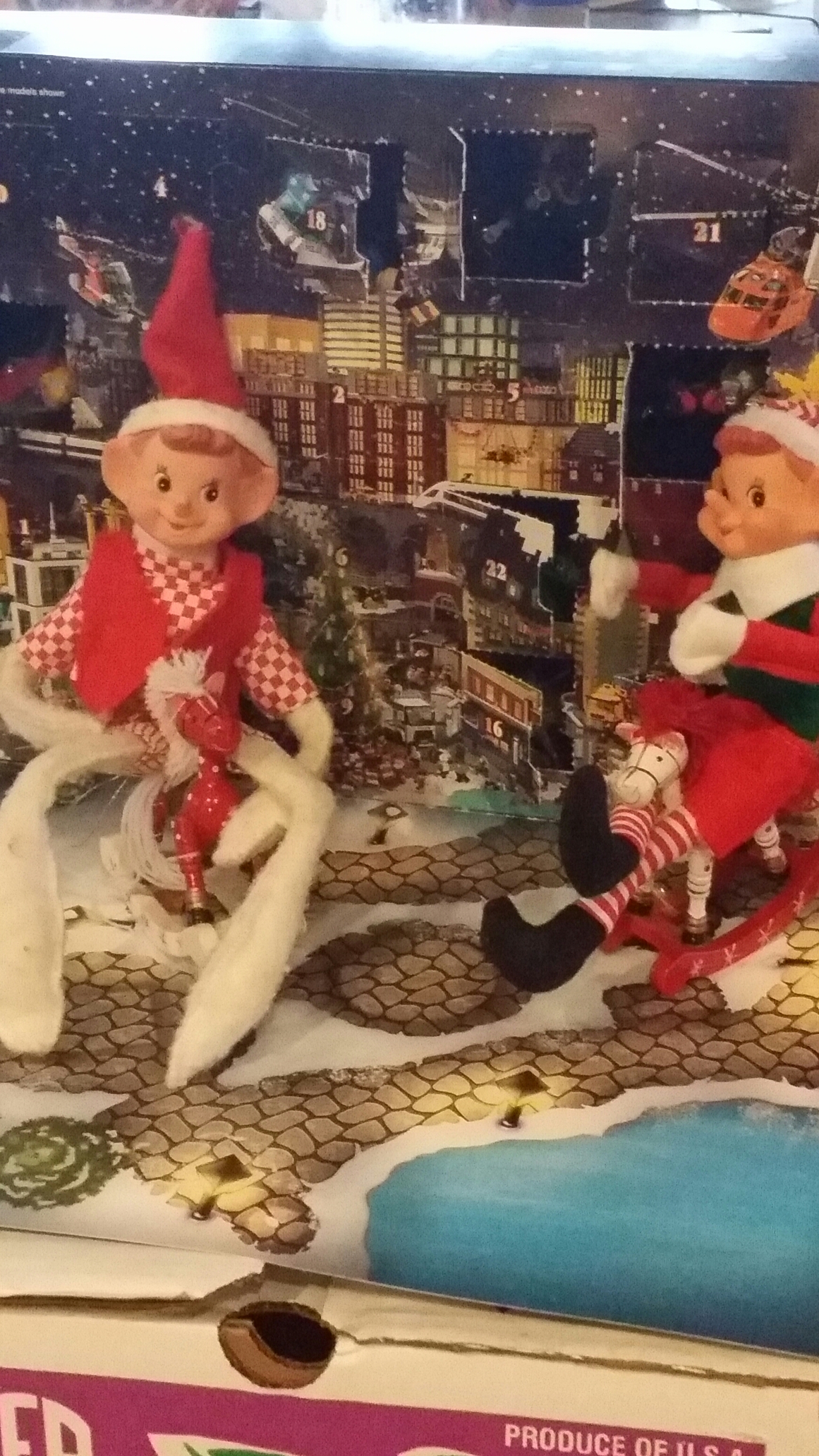 Day 13 found Elfie and Elfis riding two wooden horse ornaments.