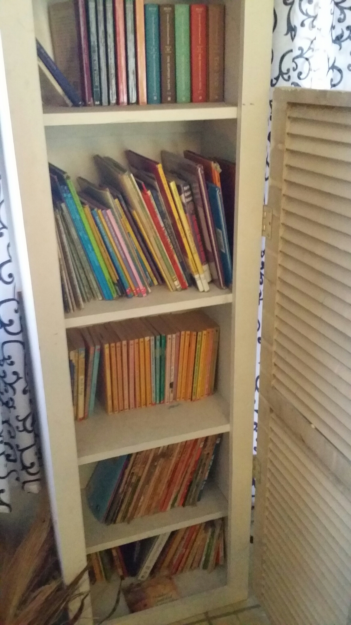 Just one of the six big shelves in our home library room – this one is all fiction, and the other five are nonfiction and seasonal books
