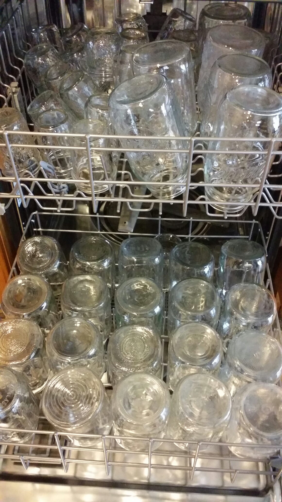 I soak jars in the sink for about three hours and then scrub them by hand. Then I pop them in the dishwasher and wash and sterilize them.