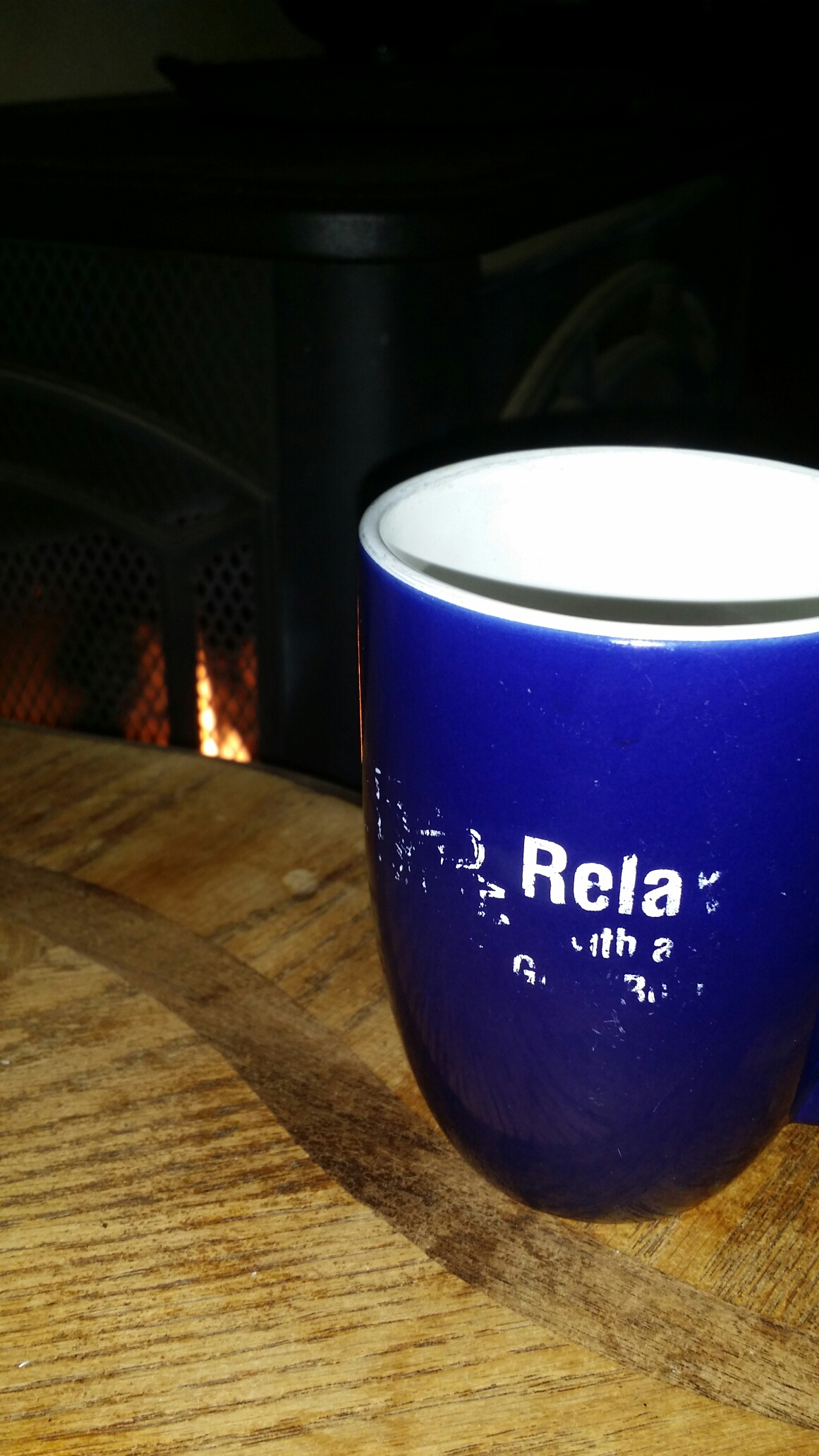 The slogan on the cup is “relax with a good book”; you can tell how well-loved this cup truly is by how worn the design on it has become!
