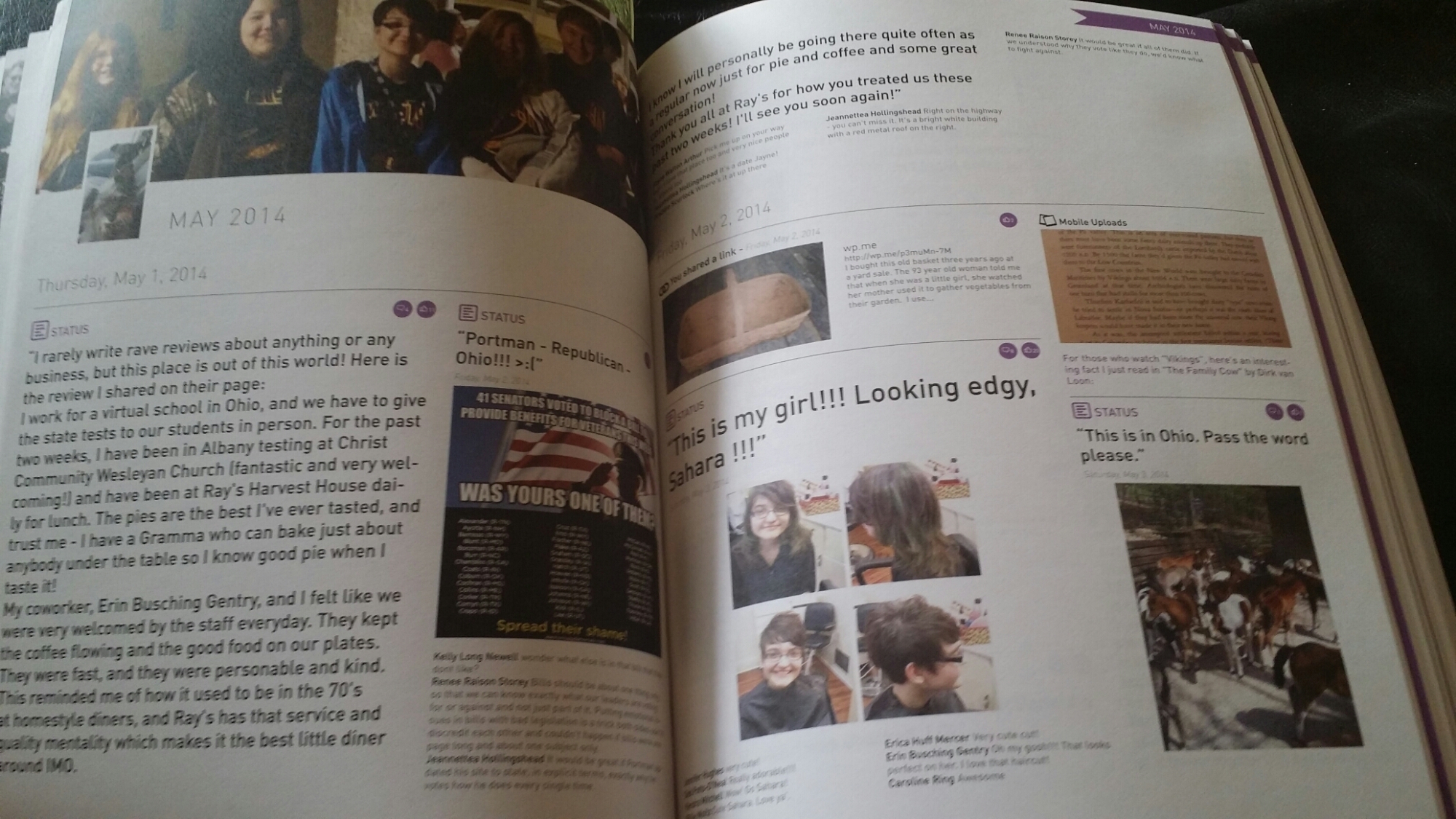 Anyway, I looked at some reviews on My Social Book and ordered it. It arrived this week. I’m so glad I got it!!! I haven’t scrapbooked since I started teaching full time five years ago, and this is a fantastic alternative; it put all my Facebook posts, pictures, status updates, shared links, and quite a few post comments in chronological order. For a book over 400 pages long, it was $66 shipped.