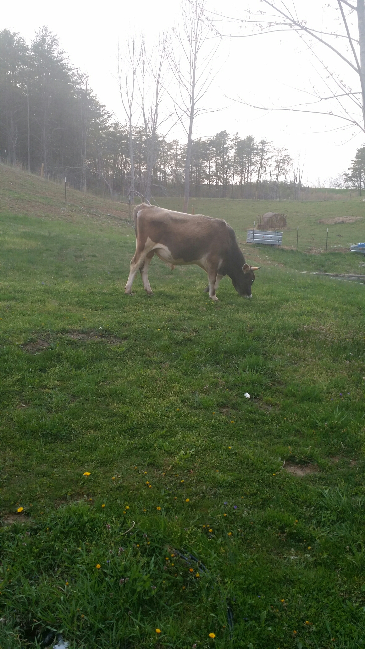 Ted came home and tied Bessie out so she could eat fresh grass as well, and I watched Beef so he didn’t come down the hill and get in Gramma’s flowerbeds. While they were all out, Ted installed electric fence insulators on all the t-posts. Beef went back in himself (so nosy he just had to see what Ted was doing), so we put Bessieand the goat back in, too.
