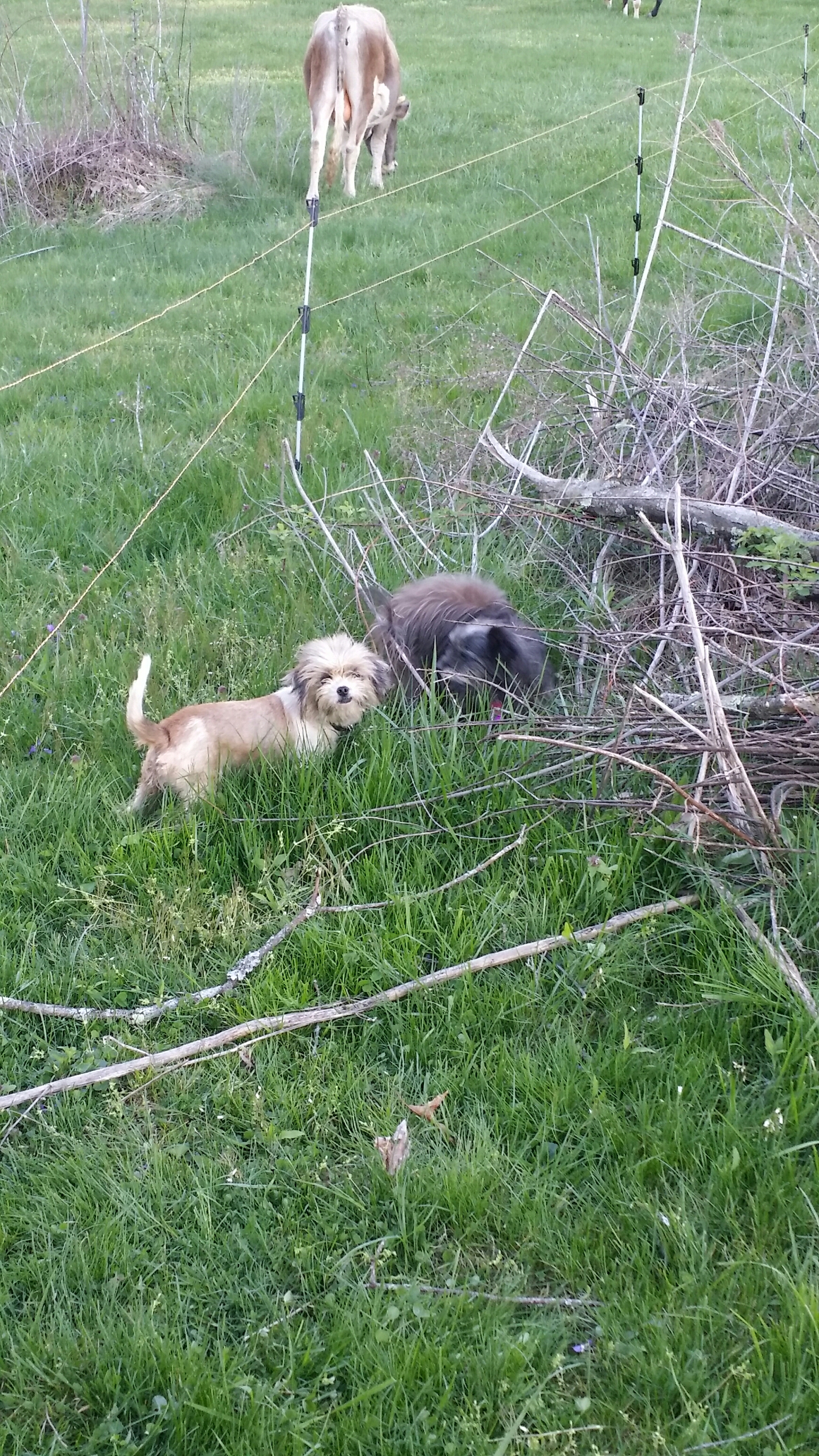 I realized if I moved the unplugged fence posts one at a time, the cattle thought it was still on and moved forward to avoid it. I could actually herd them quite easily! While he put up the new fence, I moved them slowly, foot by foot, toward the new area.