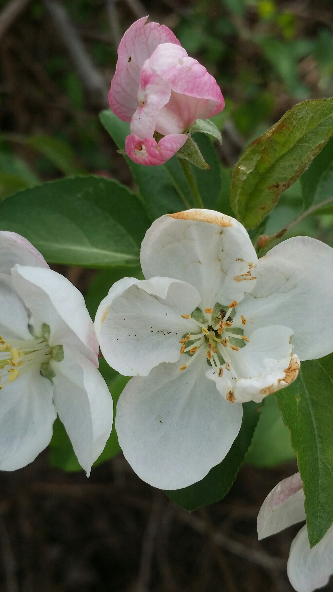 This little tree is broken over in our main driveway. I have no idea what it is. The buds are pink and then are white flowers when they open. They look very much like the blossoms on my apple tree.