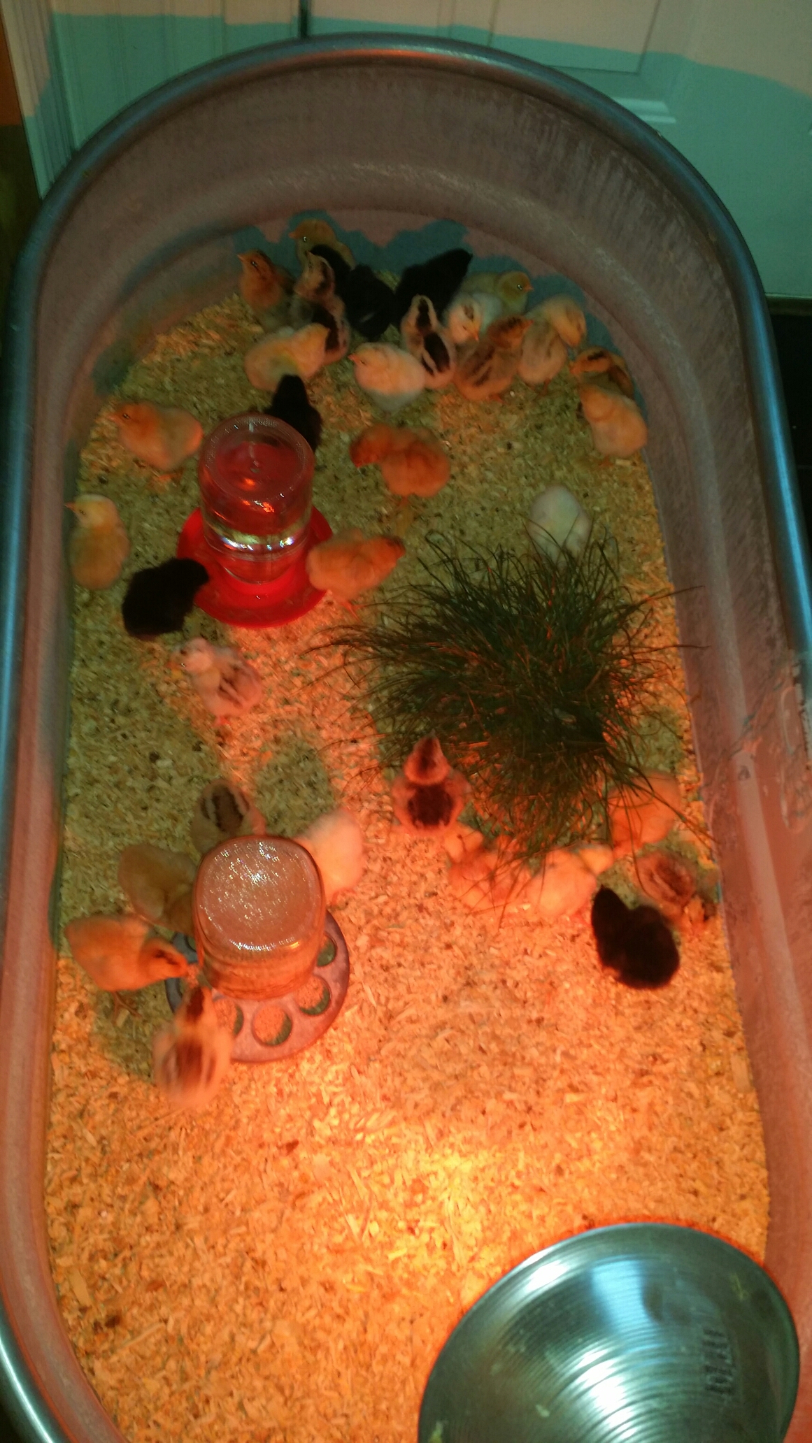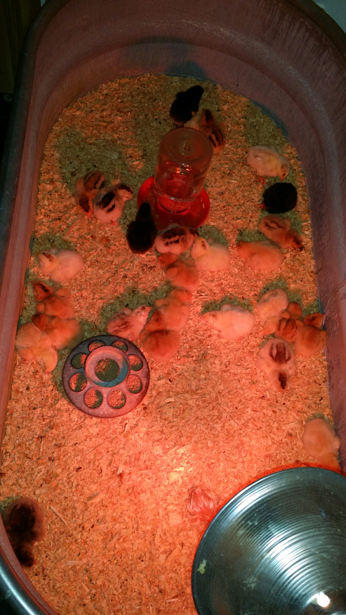 At first, I was using a box in the bathroom beside the small heater which I kept running 24/7, but since so many have hatched, Ted cleaned out the small water trough, and we’re using that with the heat lamp.