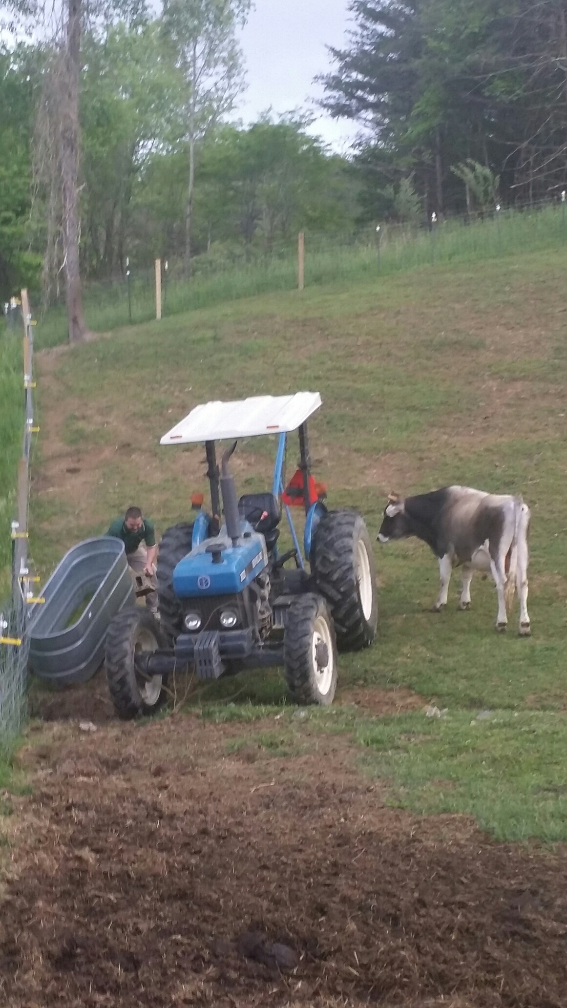 We filled the water tank, and when we went back to turn off the hose, the tank was knocked over partway. Ted got the tractor in there with the plan to lift the tank with the tractor.