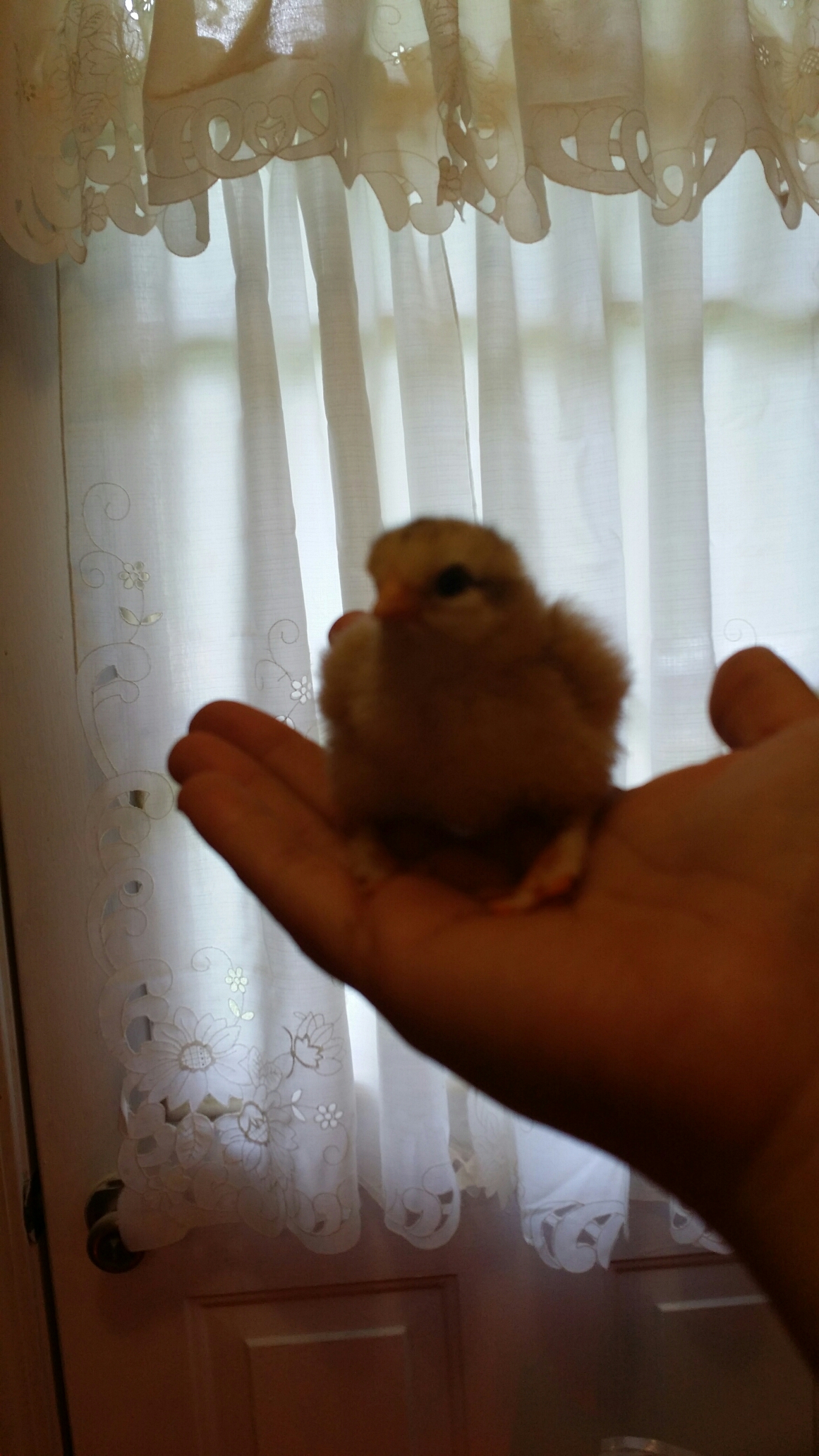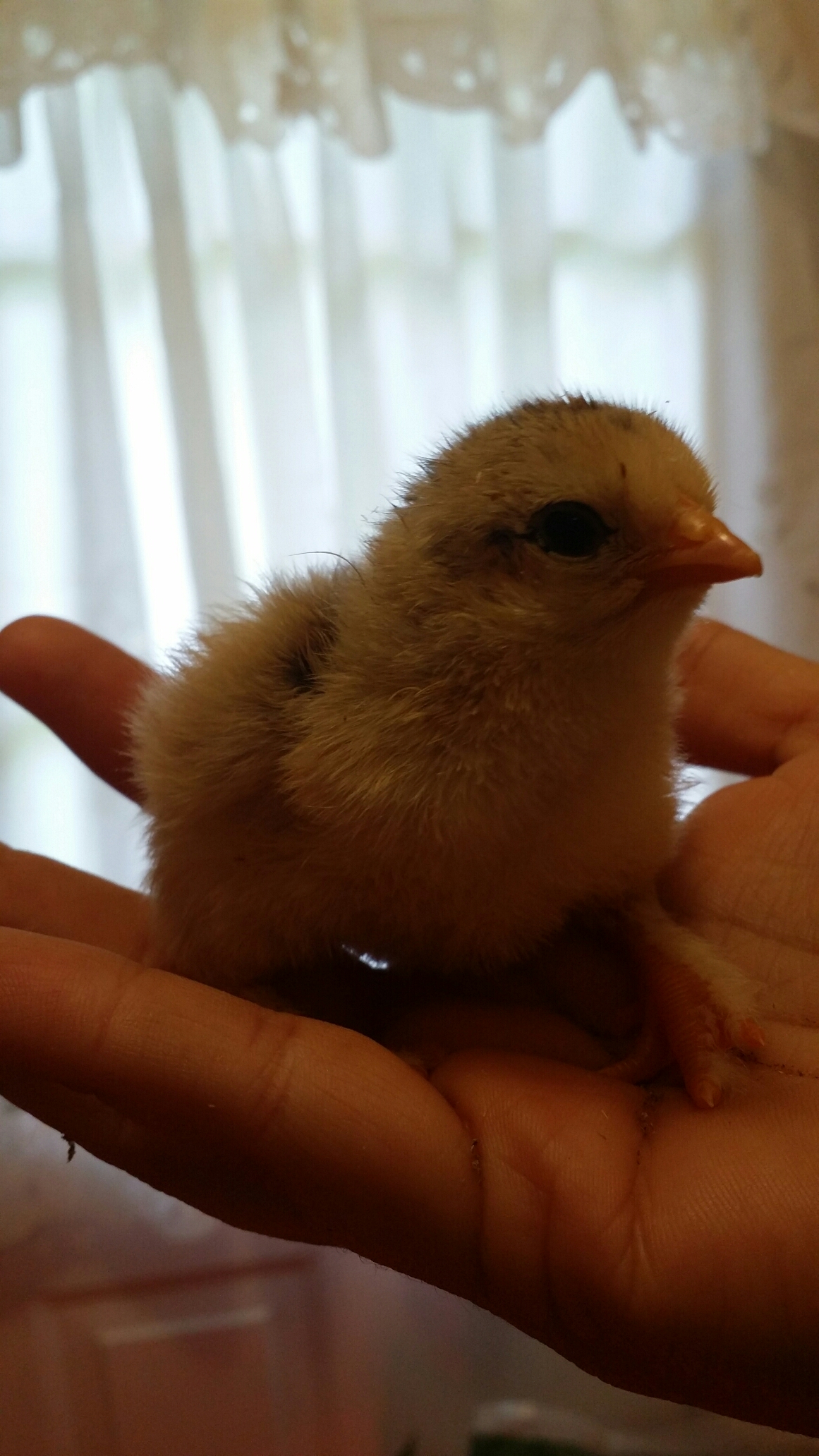 For size comparison, this is the chick that hatched late last night. She’s one day old. She came from a Maran egg, so I’m super excited to see what her coloring will eventually be!