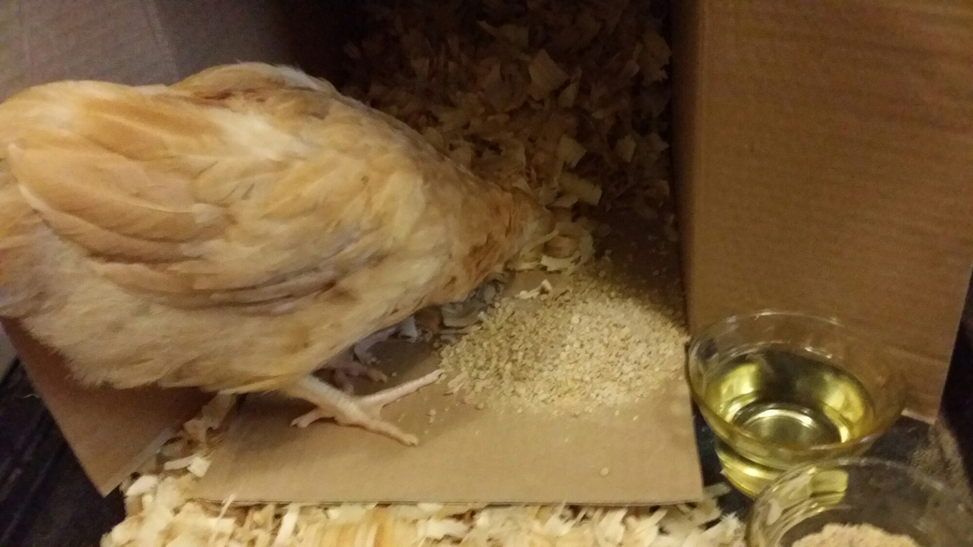 I moved her to a small dog crate and put the box in it sideways to restrict her movement (I don’t want her tiring out or pecking at her wing) and to give her a safe place to “hide” so she would feel secure.