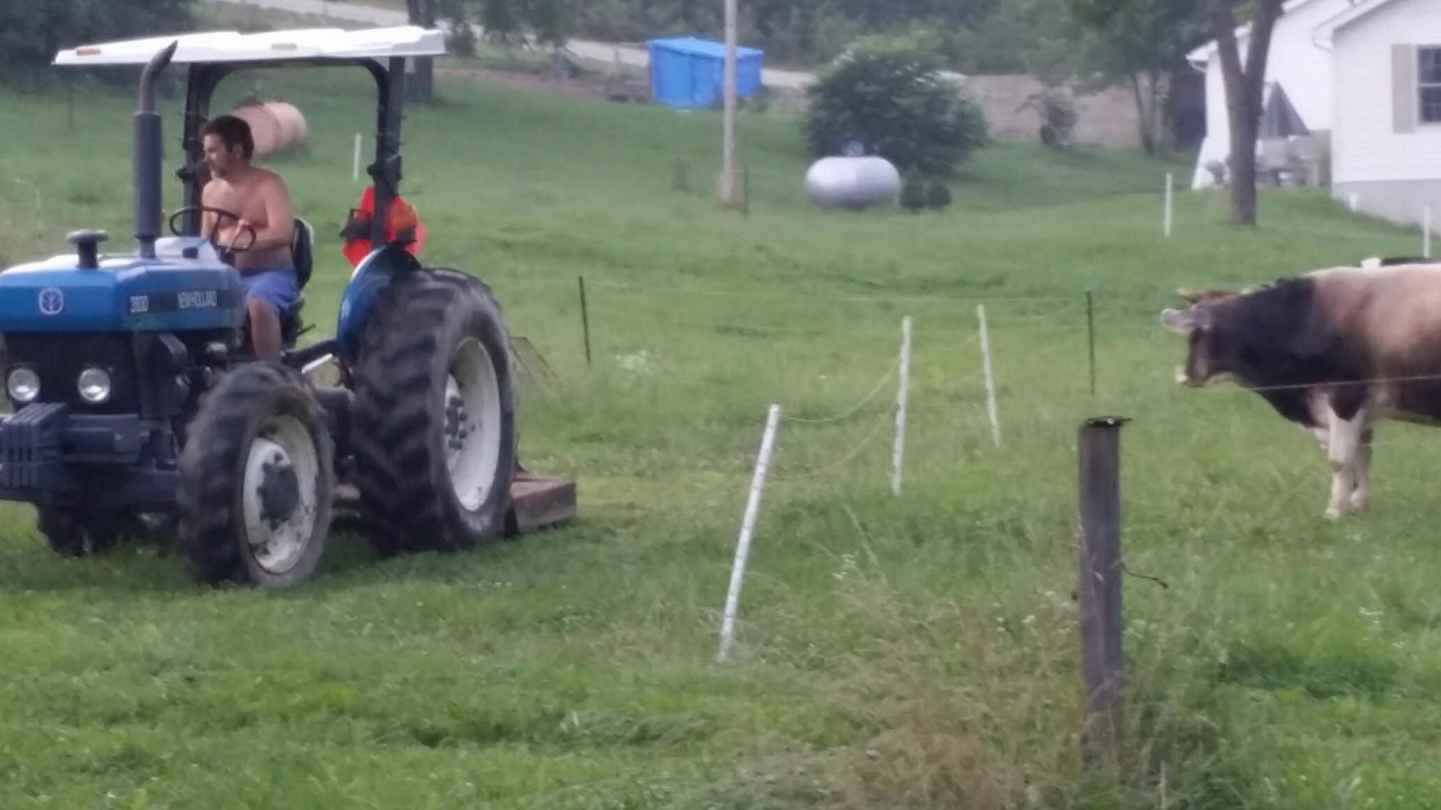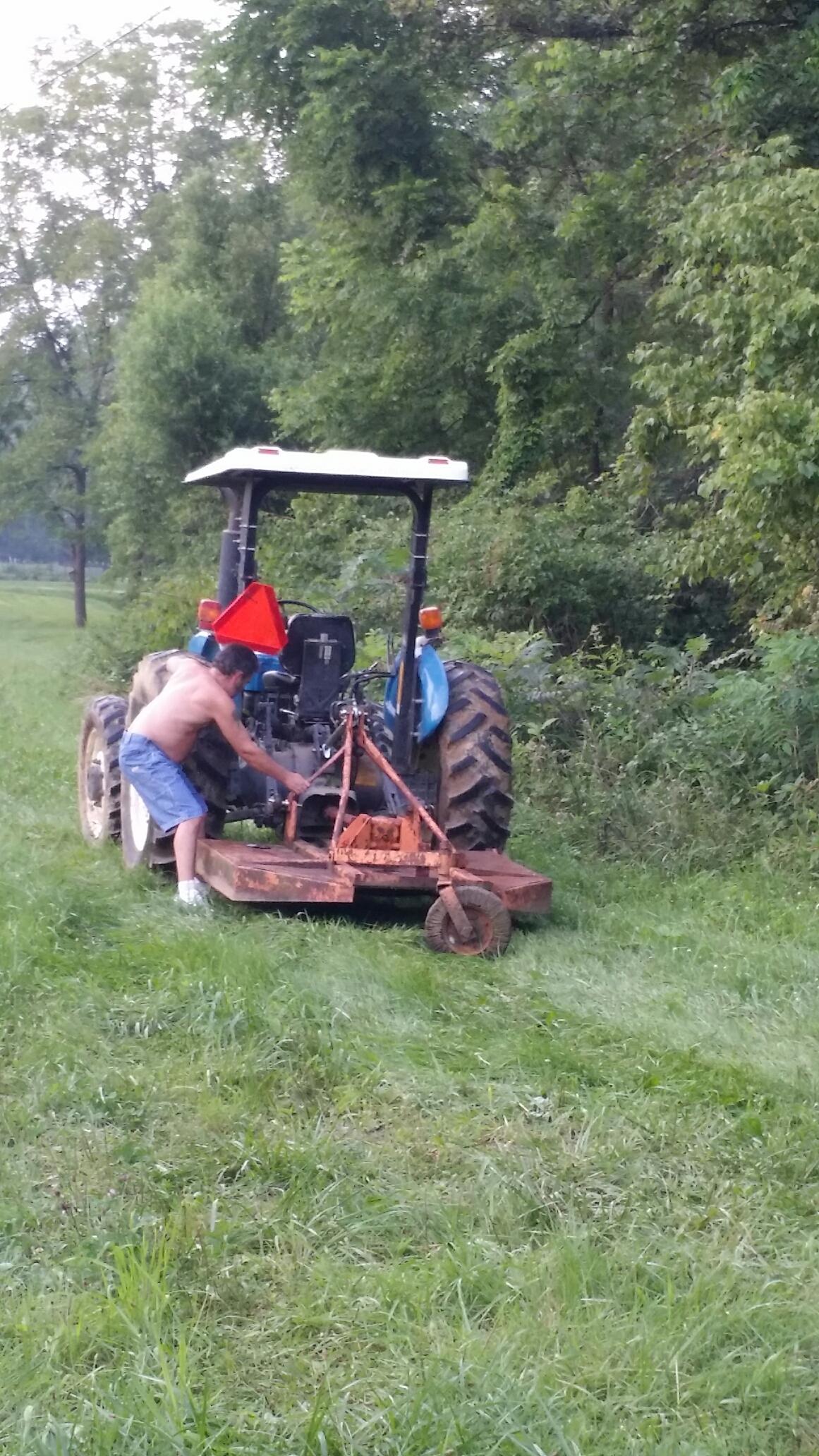 Ted bought new pins and gear oil for the bush hog. The pins were so rusty that he had to cut them out with a Sawzall, but he got the new ones in there. He added the gear oil and hooked it up…