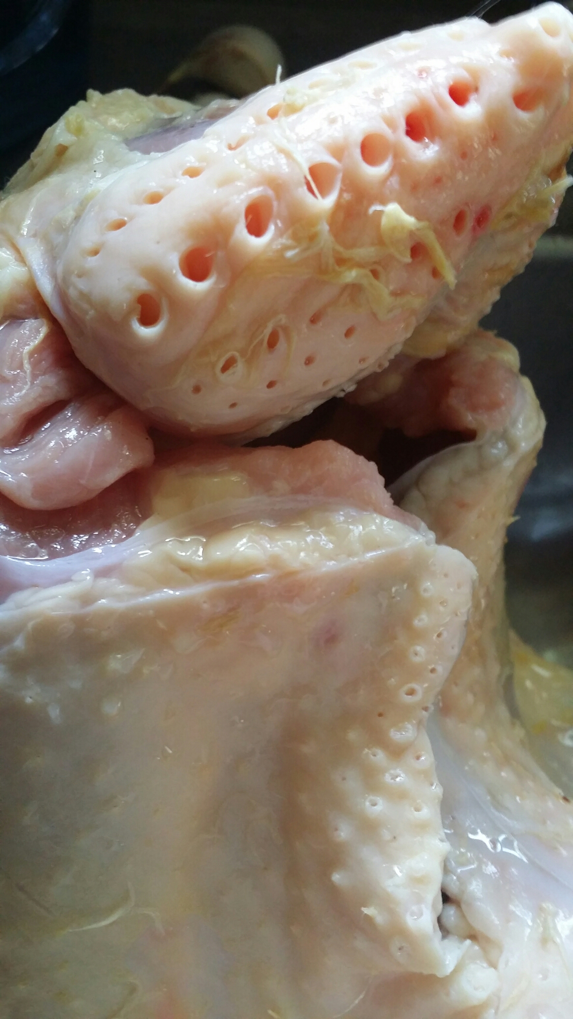 I’m not going to lie. Those raw turkeys did NOT look like grocery store turkeys. For one thing, they each weighed in at seventeen and a half pounds. There’s not much fat on them so I guess what you see when they’re walking around is what you get when they’re ready to cook, minus the head and the feet. For another thing, the wing feather holes looked like elbow macaroni. I’m not even kidding.