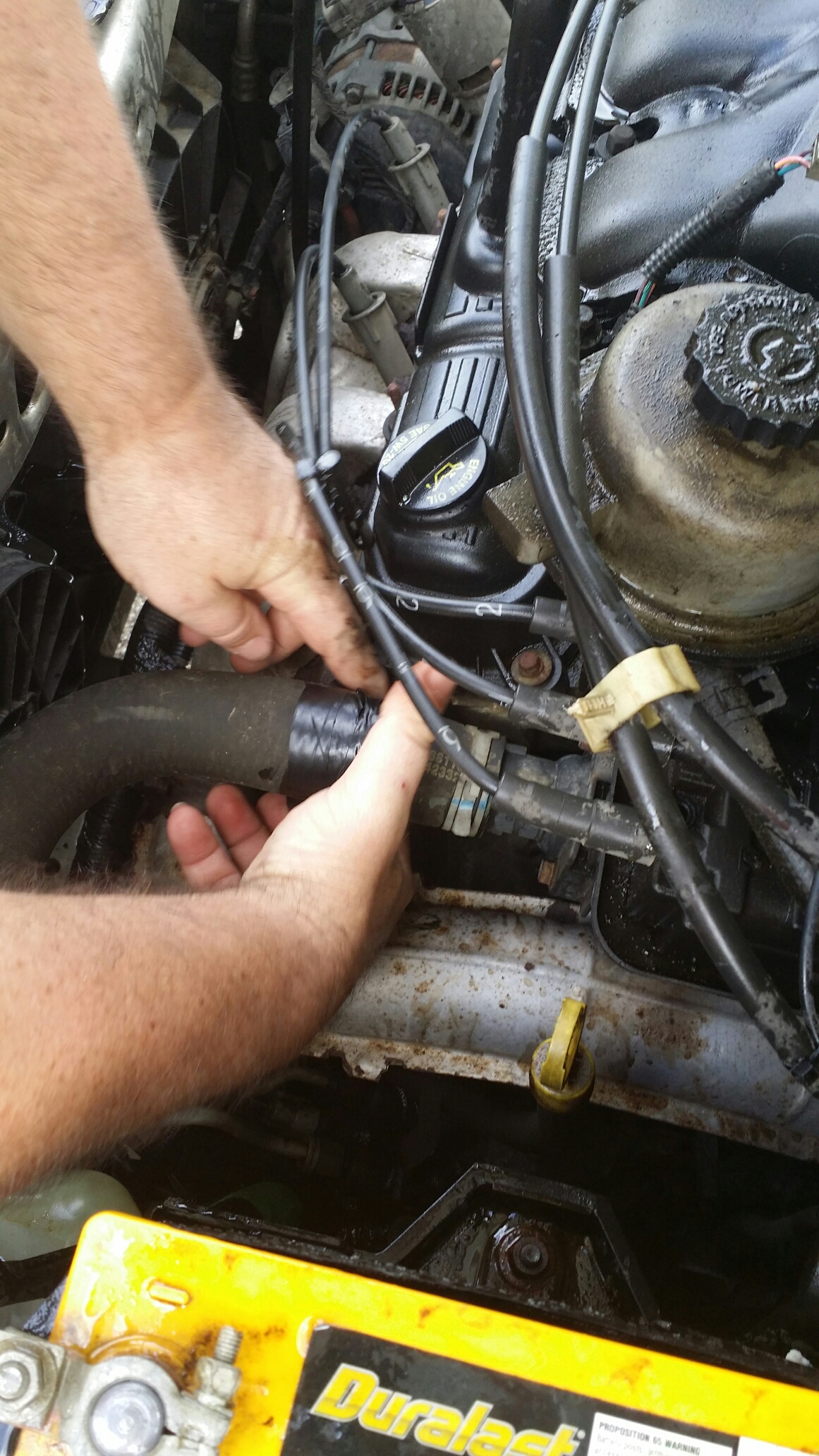 He got electrical tape from his truck, taped it up, refilled the antifreeze, and sent me to Poor Boys Tire (a local shop just back down the way) with instructions to drive no further or else “very bad, very expensive things will happen to your van”!