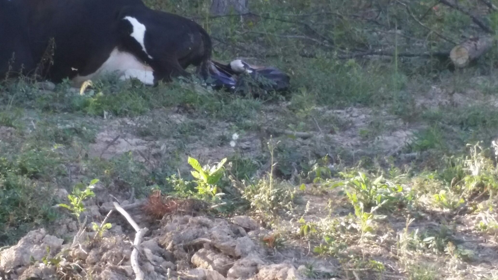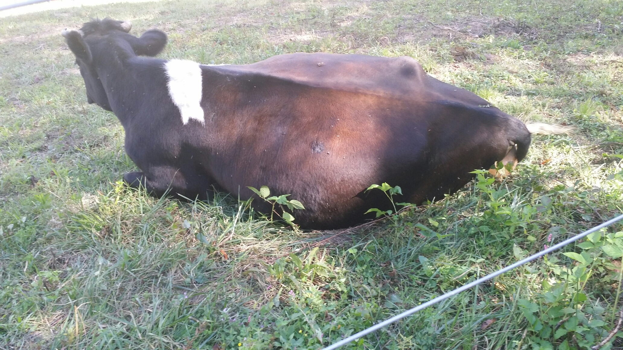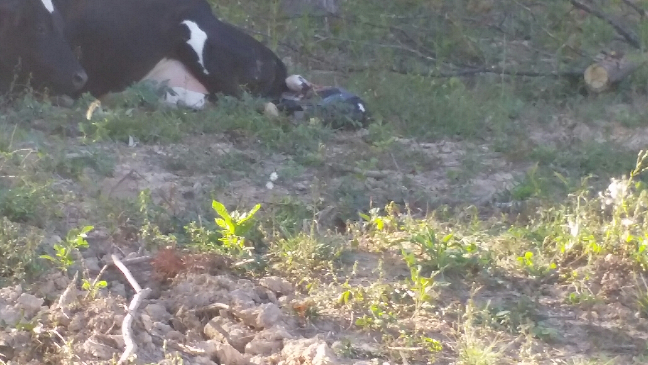 About 3:30, Gramma called and said something was protruding from Bessie, but she couldn’t quite see what it was. We flew to the field, and I flew up and around the pond, through briars and weeds just so I could get a better view.