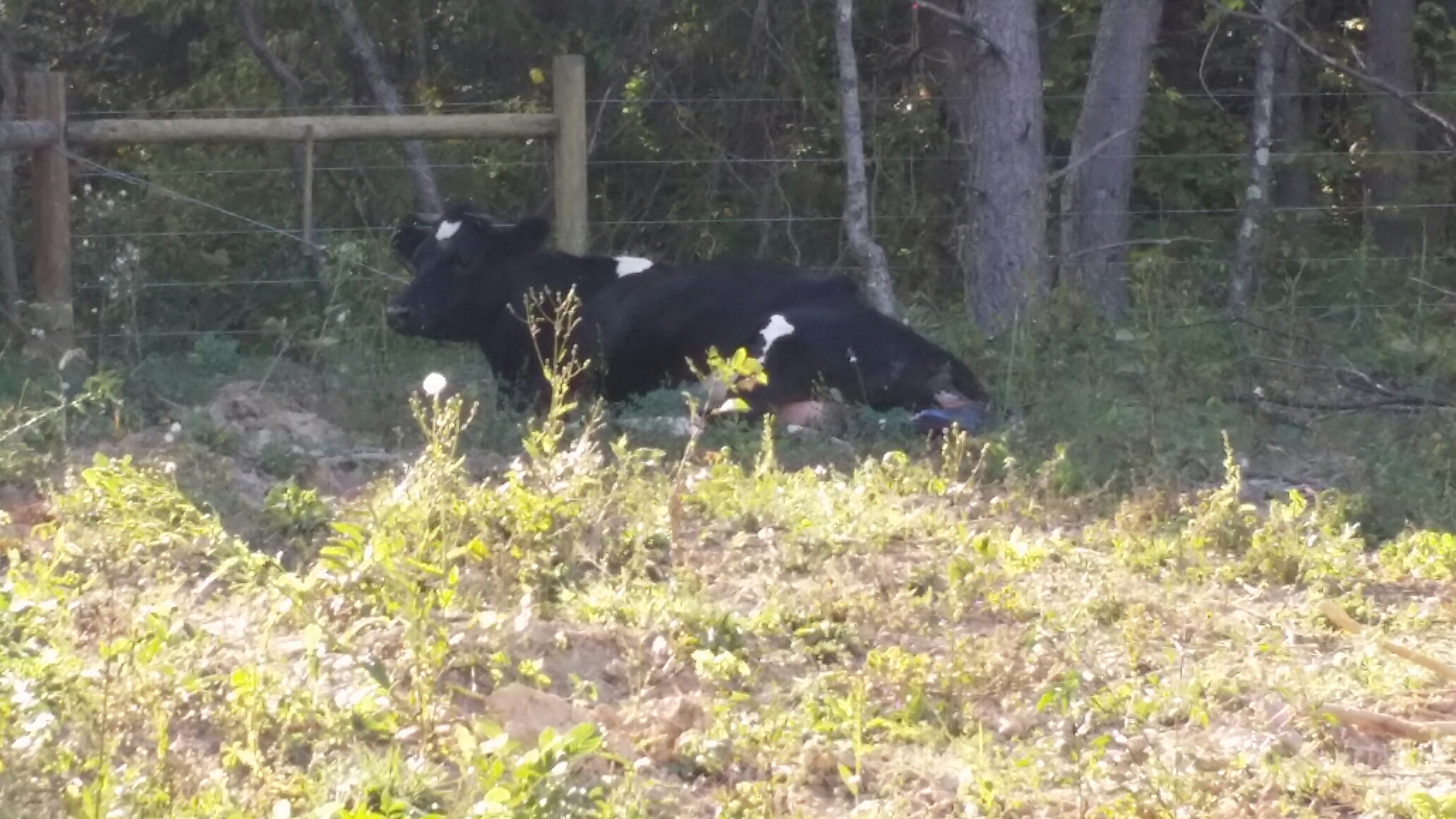 I admit it. I panicked a little. I jumped on Facebook and went to the Pastured Pig list to get advice (several folks there have cattle). I was just finishing the post when Ted gasped and said, “She’s down! She just went down!”