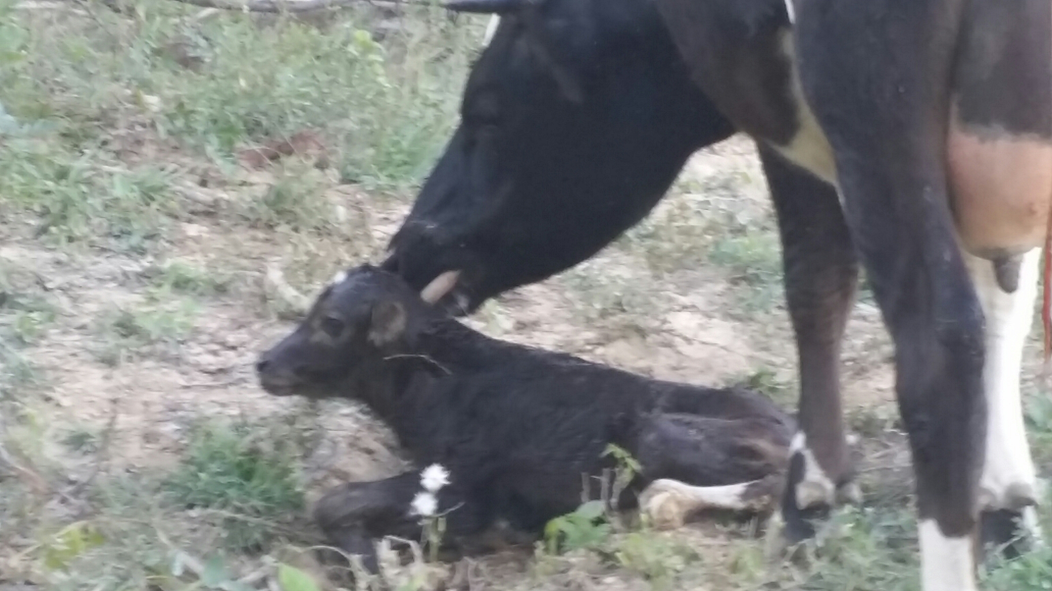Bessie seemed confused. She just wasn’t sure what this little thing was. She sniffed and sniffed it, turned her head away several times, and looked at it again and again. The calf was trying to move around, and when it rolled a little, she moved around and stood up, and she started to lick it.