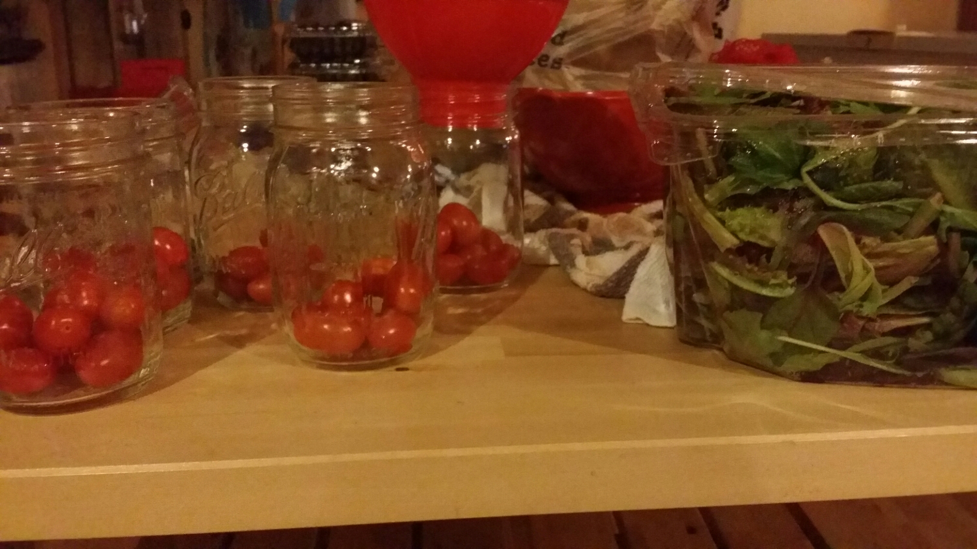 Put the bigger items like onions, radishes, cucumbers, tomatoes, etc. in the jar first and then add the greens (that way they don’t get soggy). It’s the perfect size for a lunch salad!