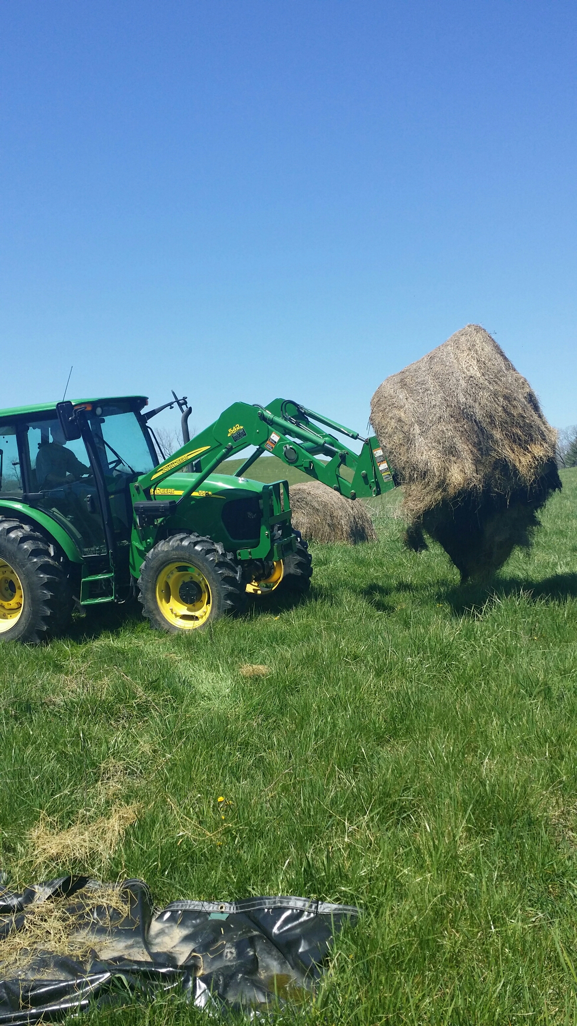 We put it to good use! Ted use the seeder that we bought from the Christmas tree farm down the road and dumped at least 200 pound of seed all over that pasture, and then using our tractor he unrolled these old hay bales here and there to try to keep the seed on in case it poured the rain.