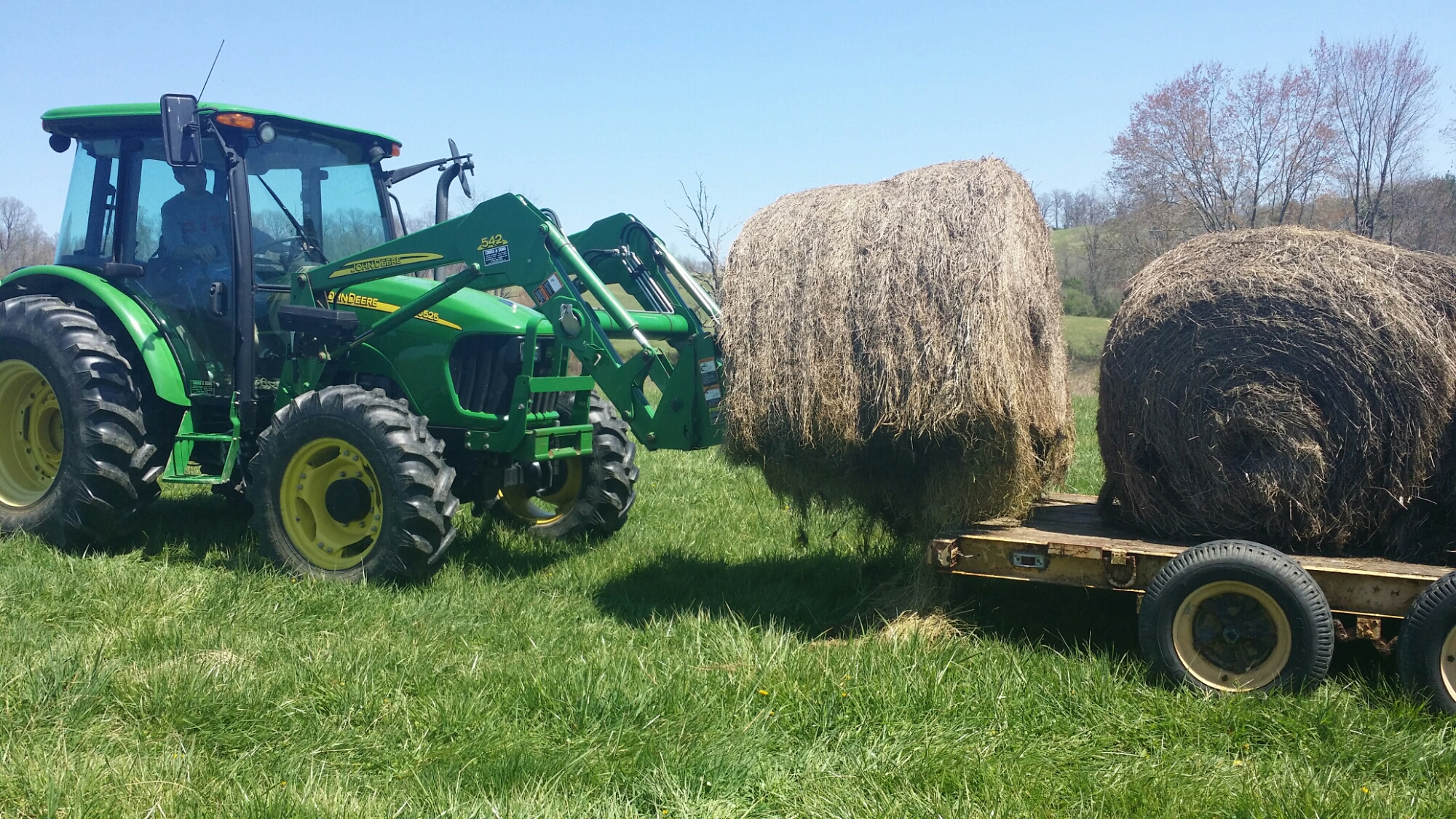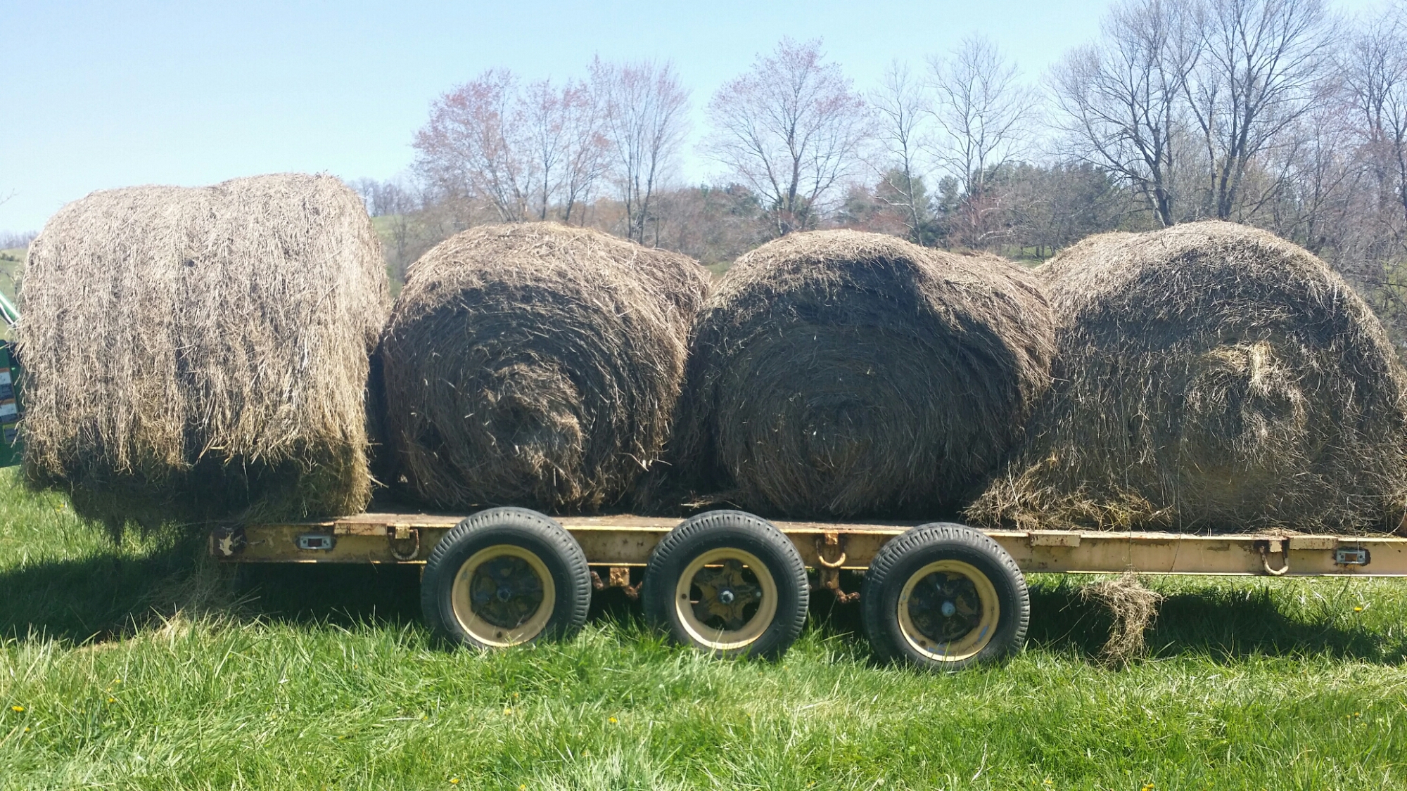 About three weekends ago, we went out to Mr. Johnson’s farm with the trailer. I had stopped by there the previous week when I saw him out and about and asked him about some of the really old hay bales he had setting outside. Once hay has been setting out for about a year it loses a lot of nutritional value. Farmers then sometimes use it for bedding, but once it gets to the point where it’s completely falling apart, it really isn’t good for much except compost and putting it into your fields when you’re going to reseed. I asked him how much he would charge us for these bales, and he said to come on back over with trailer and we could have some for free.
