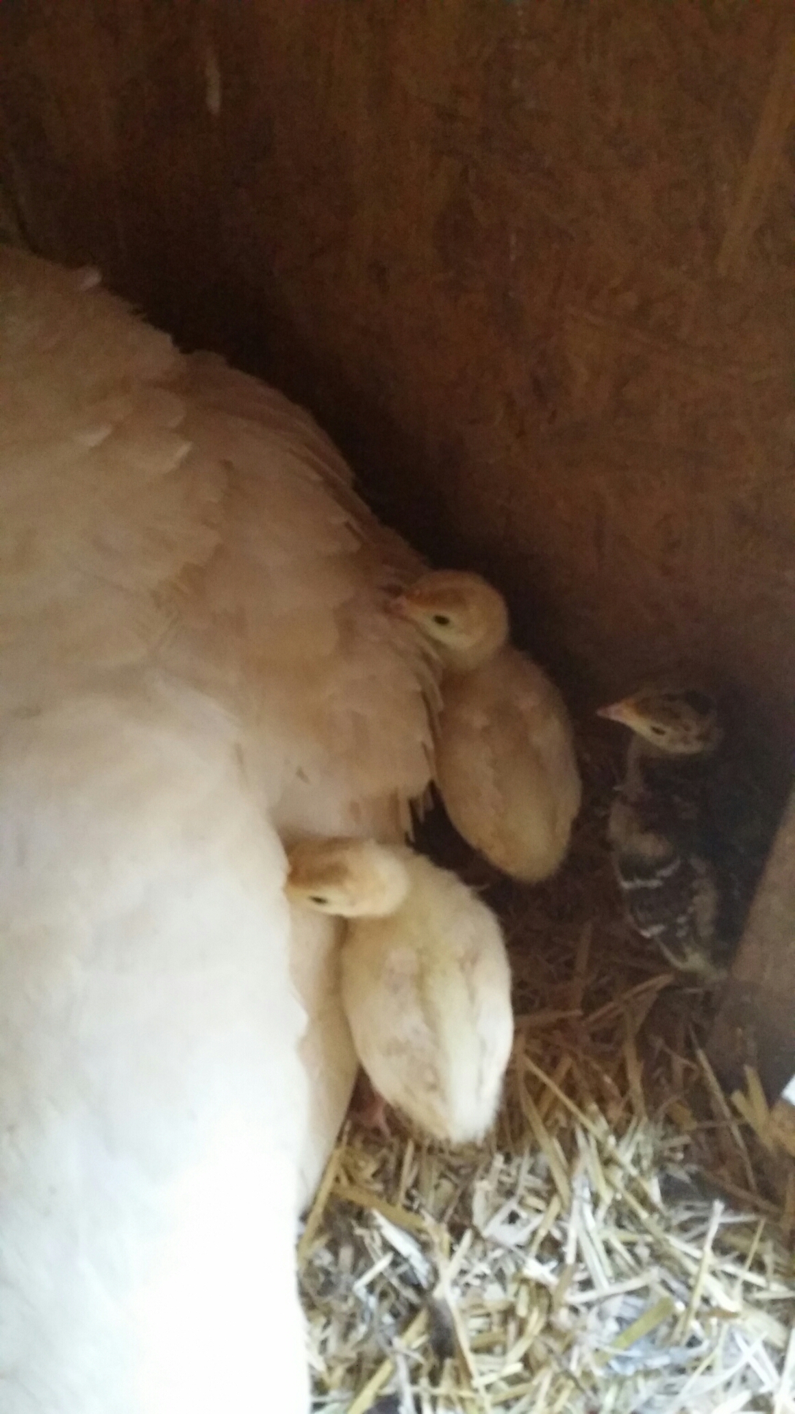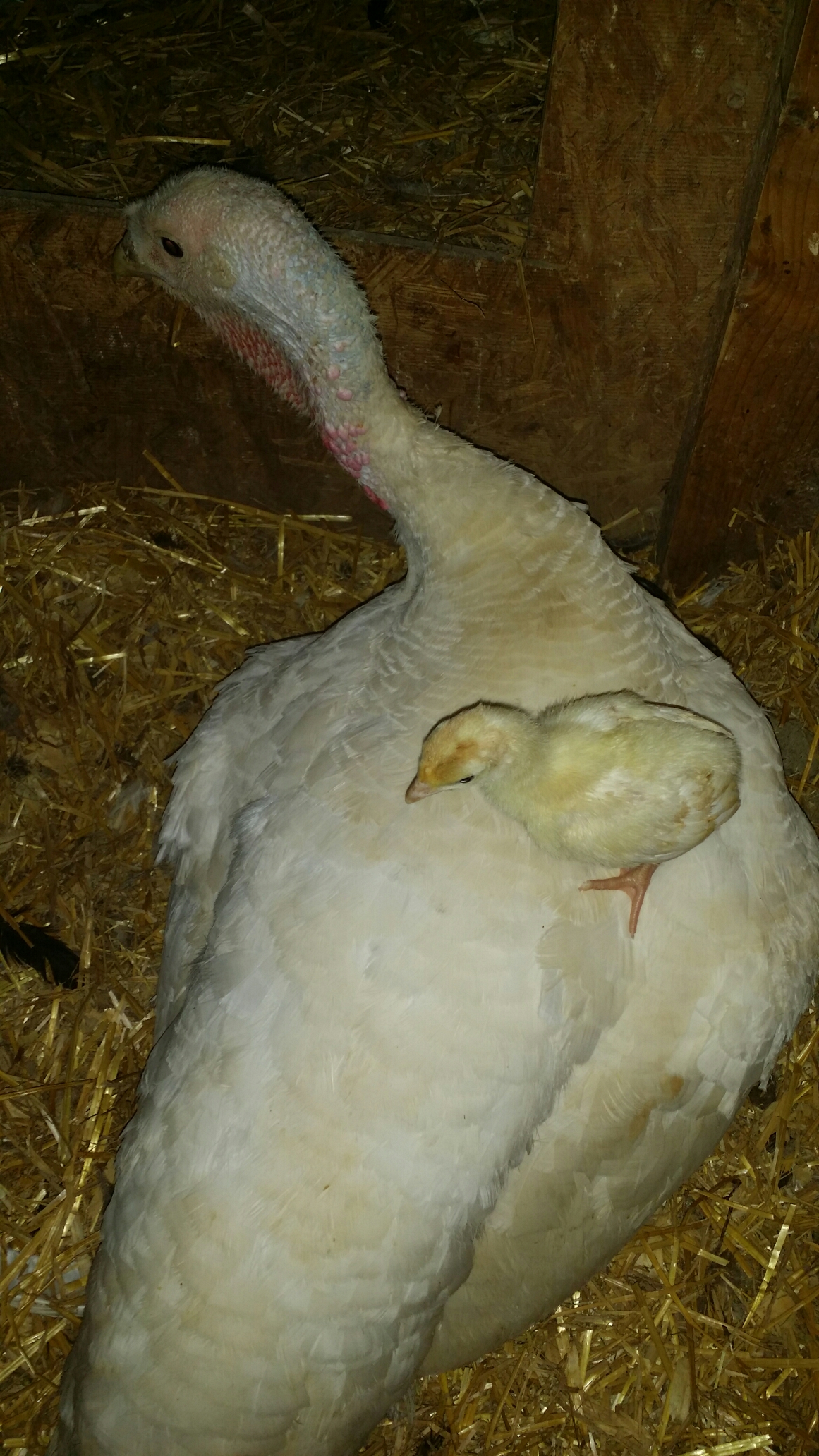 Thank goodness she is not a mean turkey when she setting on eggs! It’s a little different taking eggs from a setting turkey then it is from setting hen. The turkey was right at eye level with me when I knelt down to get the eggs, but she just kept pipping at me and being upset because I was taking the eggs. Then we popped four babies under her and waited to see what she would do