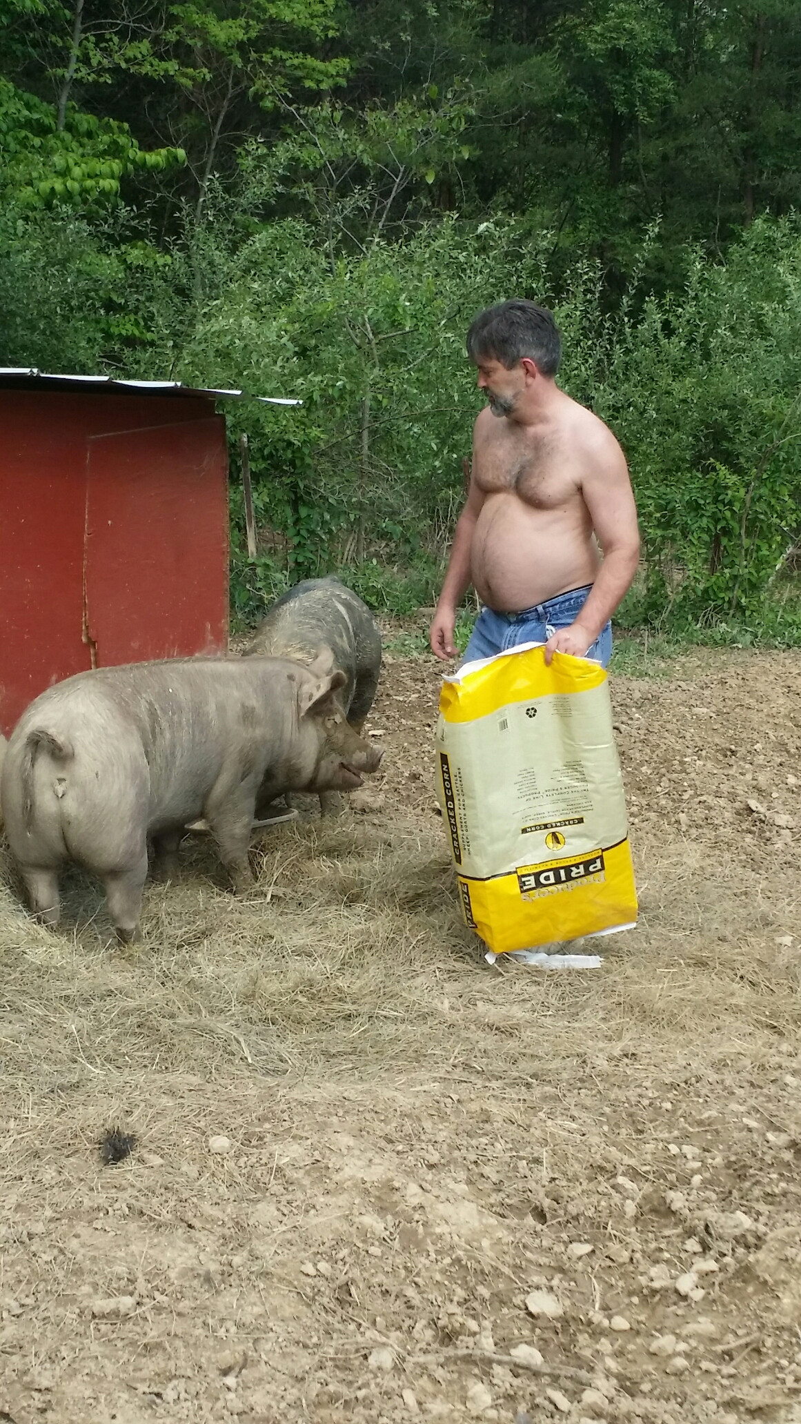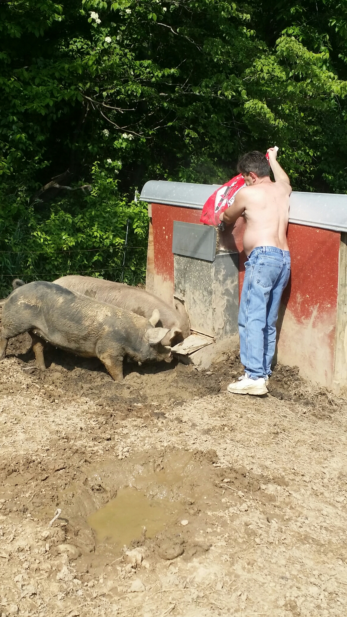 They are standing in about six inches of mud here (Ted made them a big mud hole a couple of days ago because it was so hot, and pigs can’t sweat so they need mud so they can cool off).