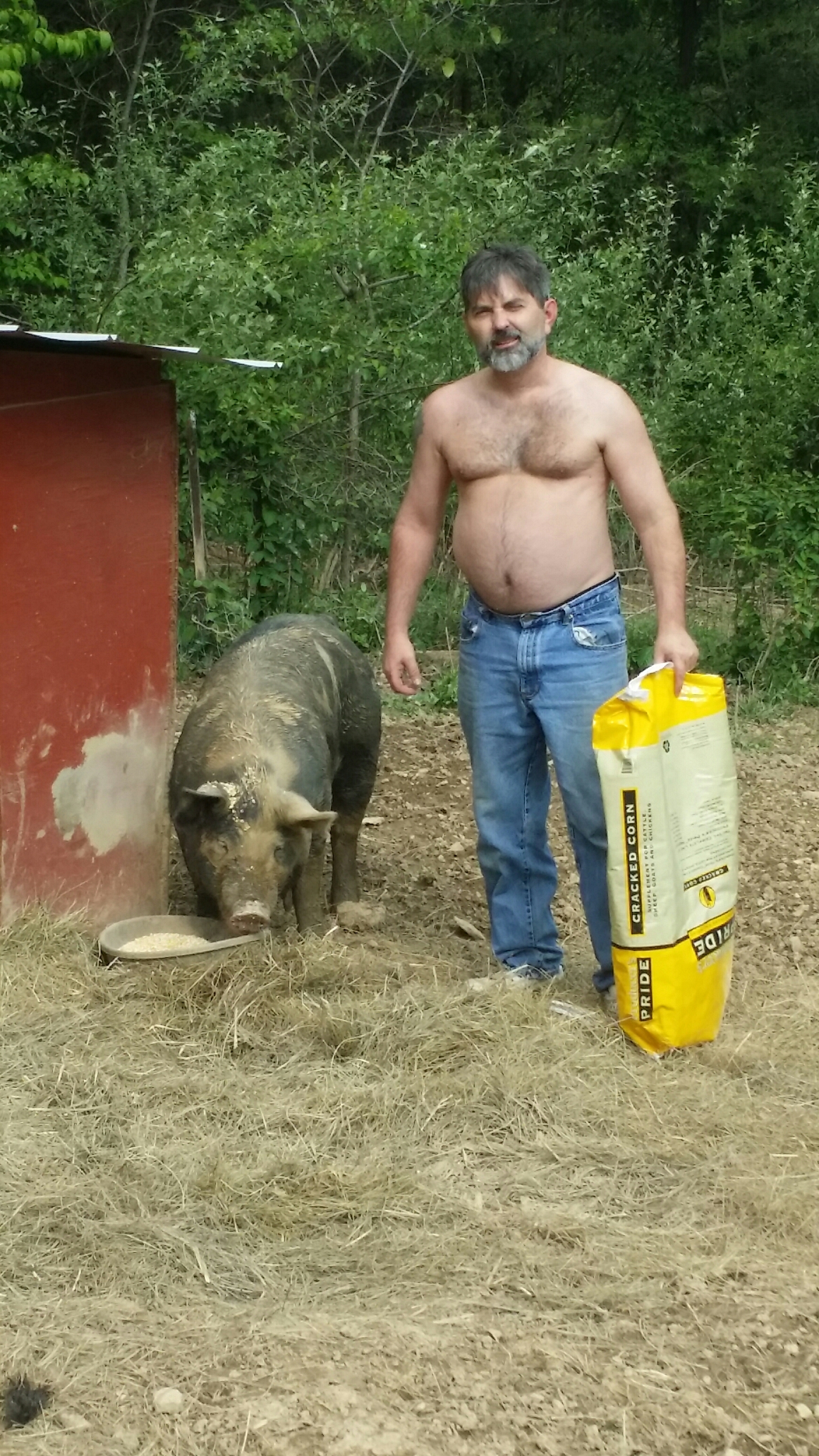 Bitsy kept knocking Dixie away from the corn so Ted poured her a big bowl just for her. Here you can really see the sheer size! We’re guessing she’s about 300 pounds of solid pork.