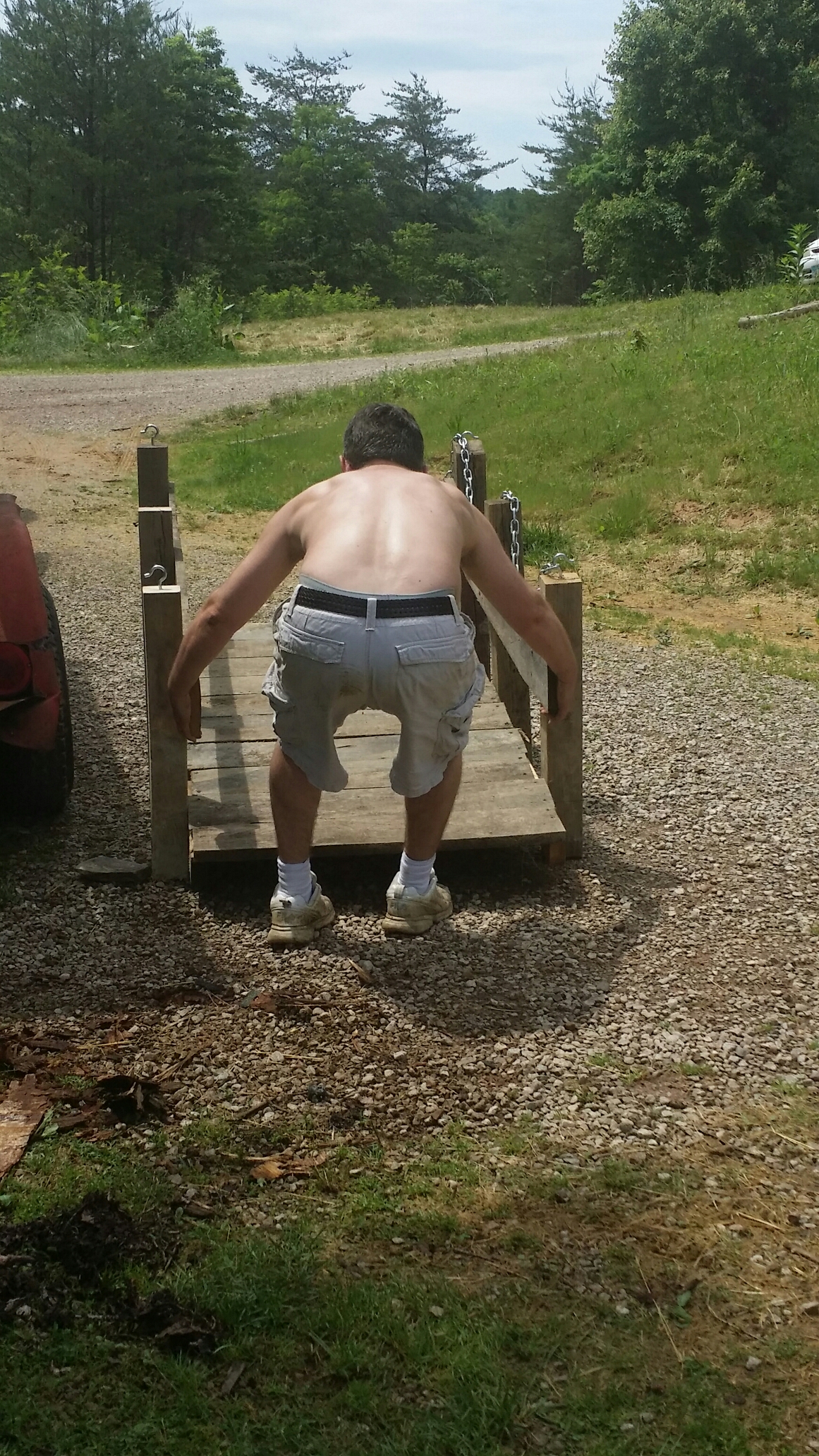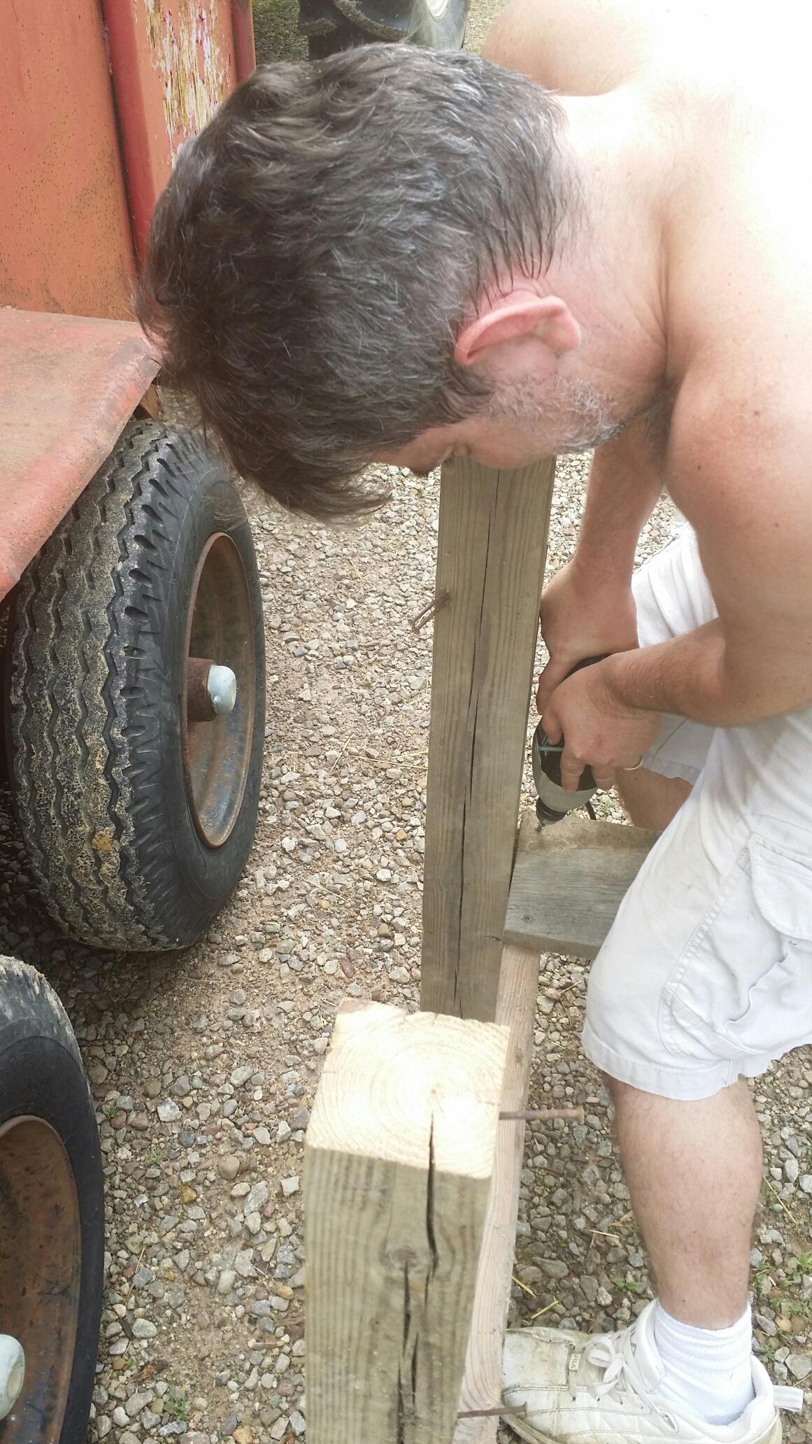 Monday, he worked from the time he got up until it was dark outside. His first project of the day was building a ramp for the trailer because we’d hoped to load the pigs up that evening (more about those pigs in tomorrow’s post). He did this all from scratch with repurposed materials, and the only new thing he purchased for it was one piece of chain for $14.