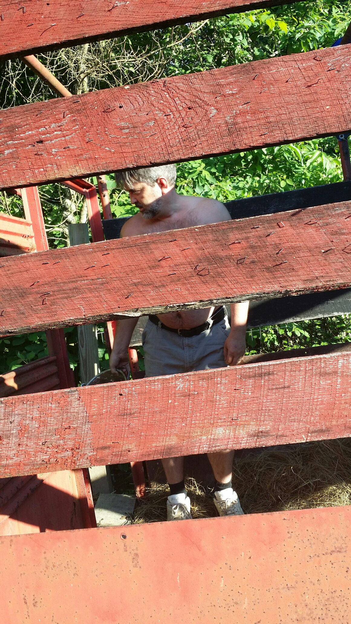 I ran to get his chainsaw to cut the gate post down, and he started on it. They kept happily eating and drinking beer. If I’d been in that trailer and someone started a chainsaw up five feet behind me, I’d have shimmied up the trailer walls and flopped over the top to get away. Those two never budged.