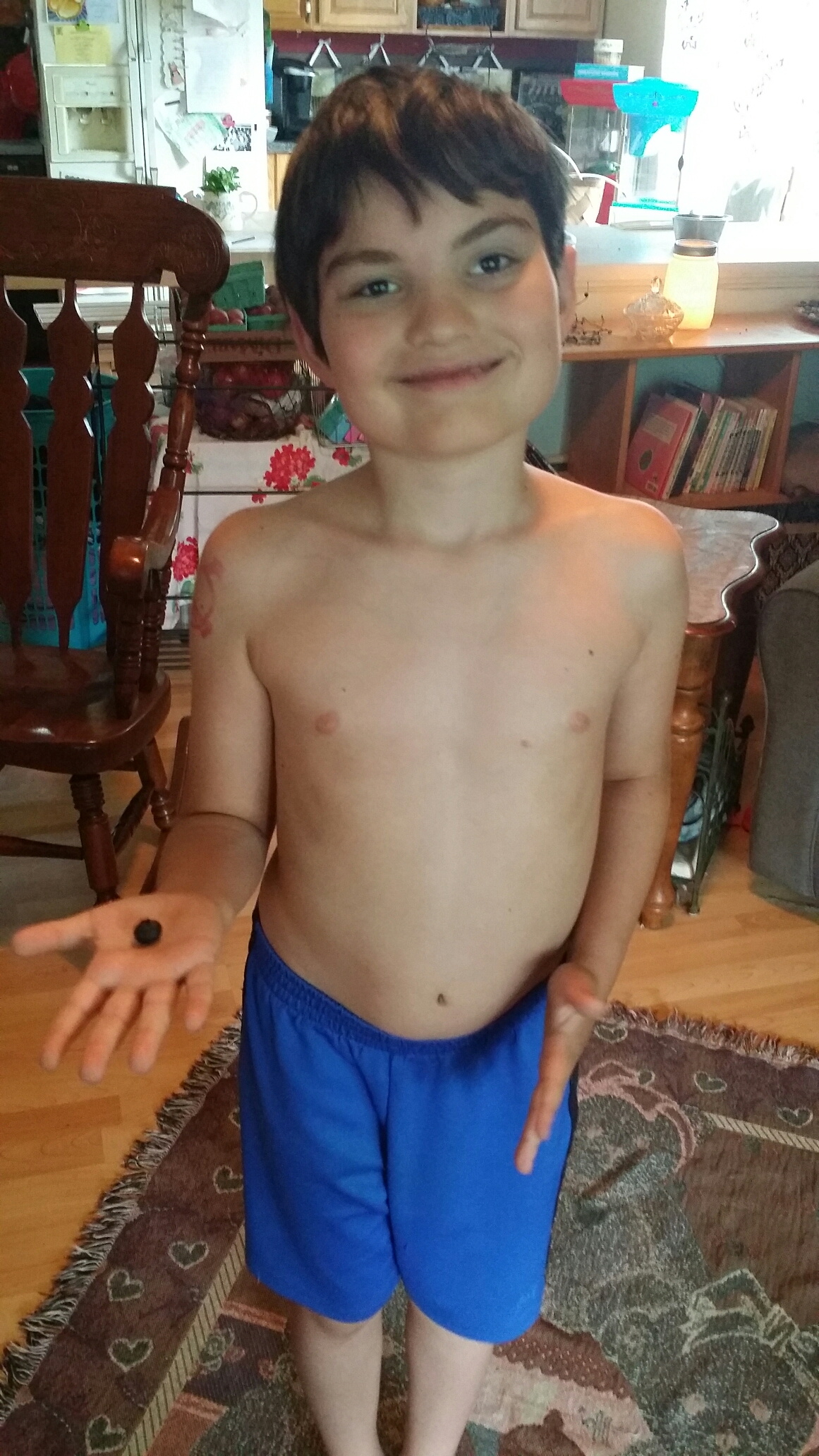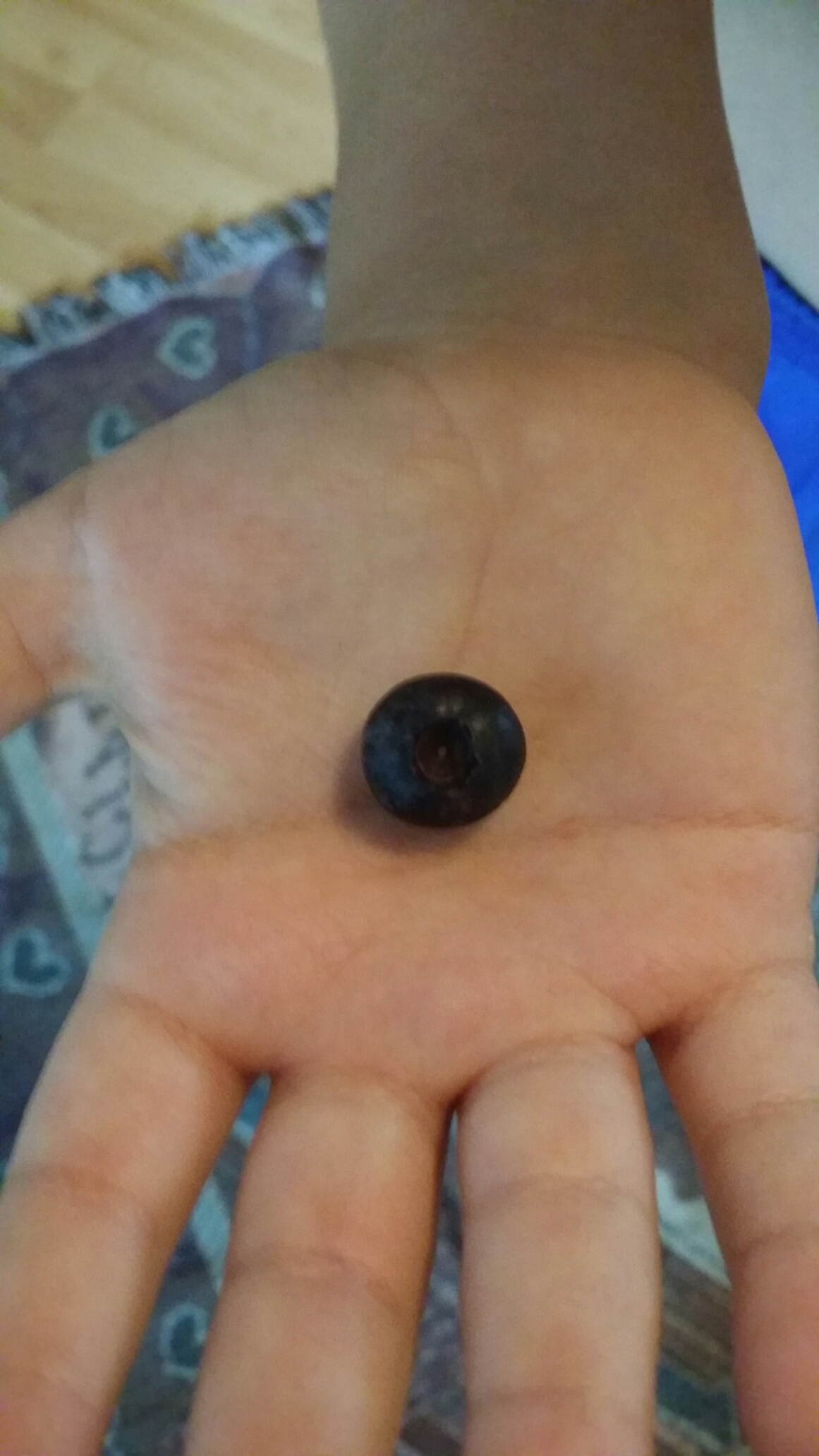 Four of the bushes have a few berries on them just starring to ripen. One blueberry bush is covered with blueberries though, and today, Jake picked the one and only ripe blueberry from it!