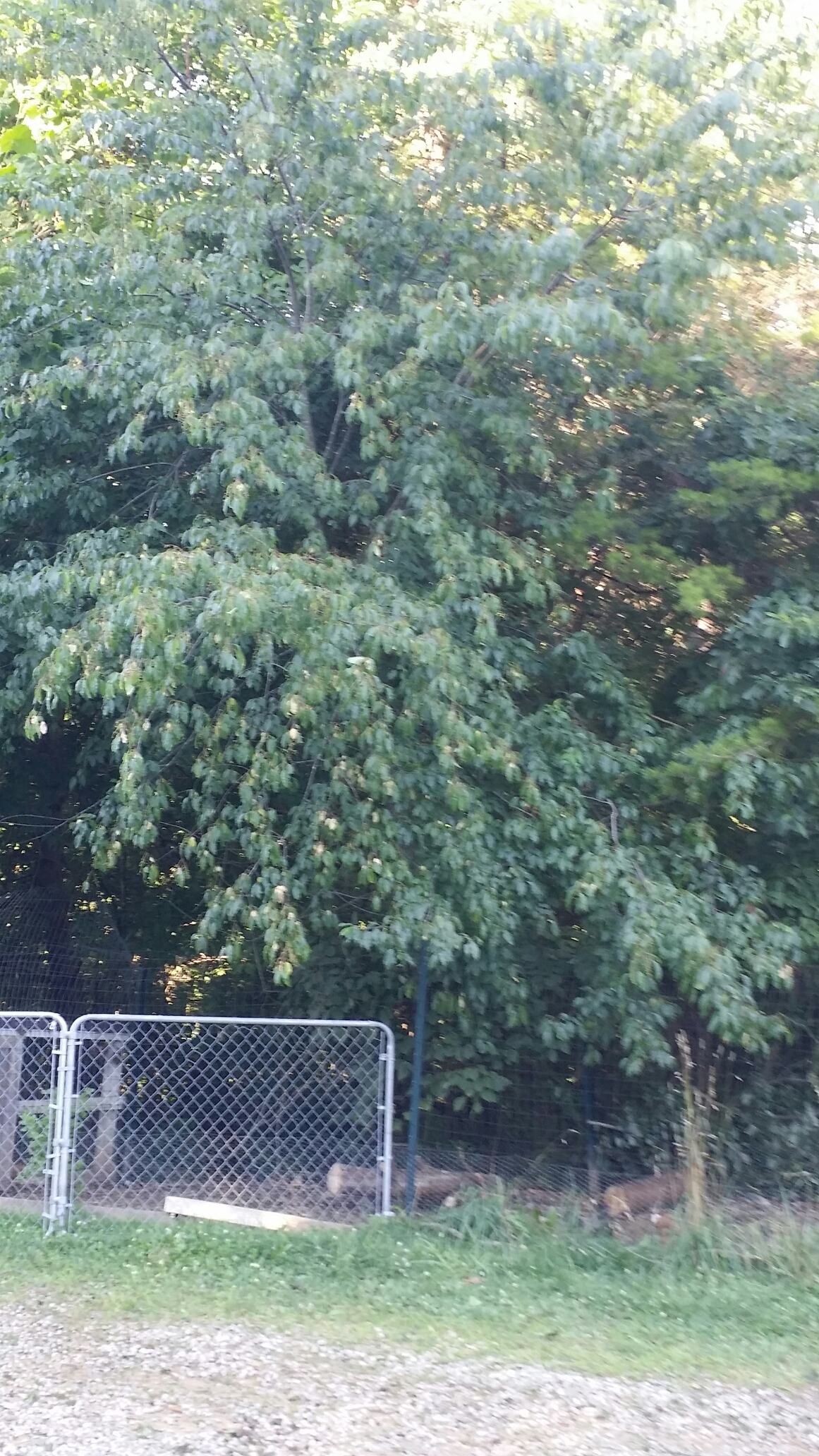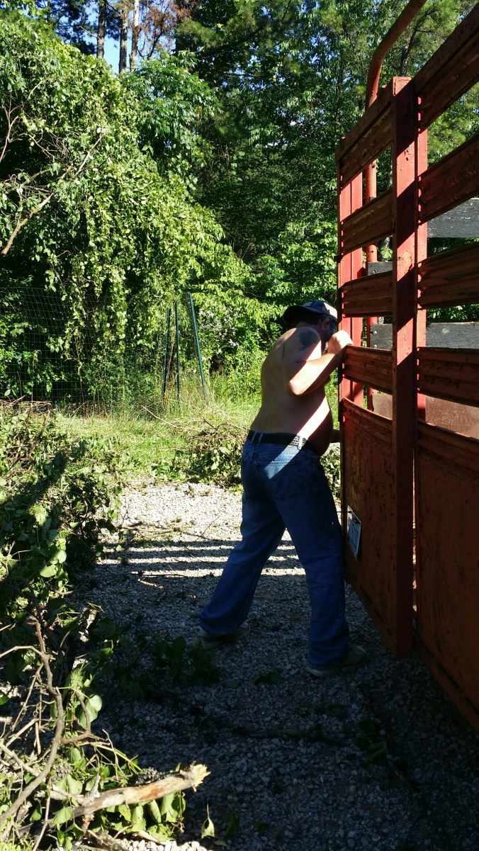 …Ted worked on cutting down a tree that fell across the small chicken yard and driveway. He started working at noon, and we just finished now at 6:37 p.m. The tree fell sometime last night during the storm and smashed down two t-posts and about 16′ of fencing.