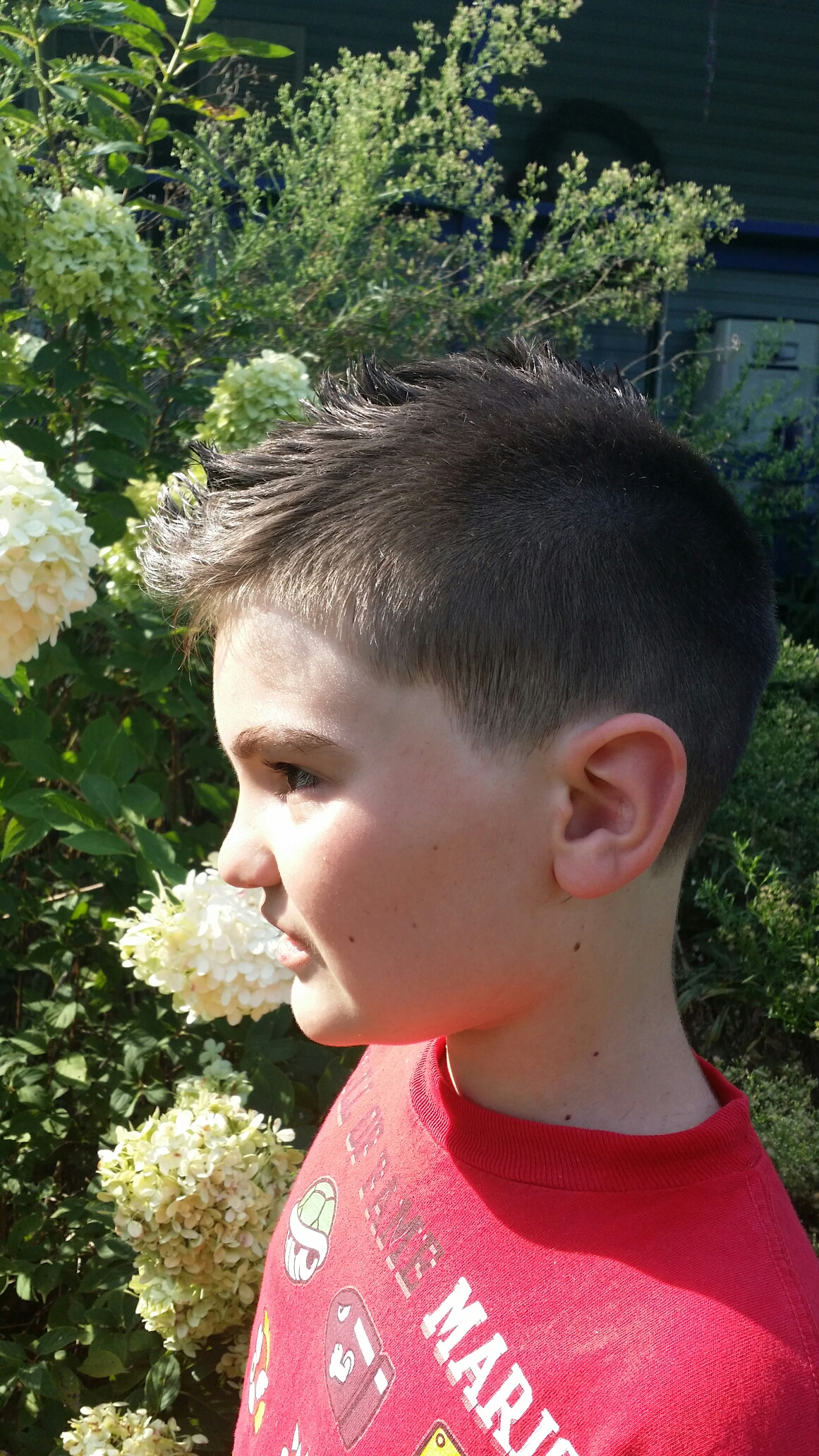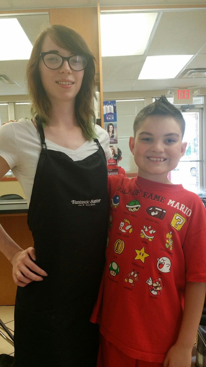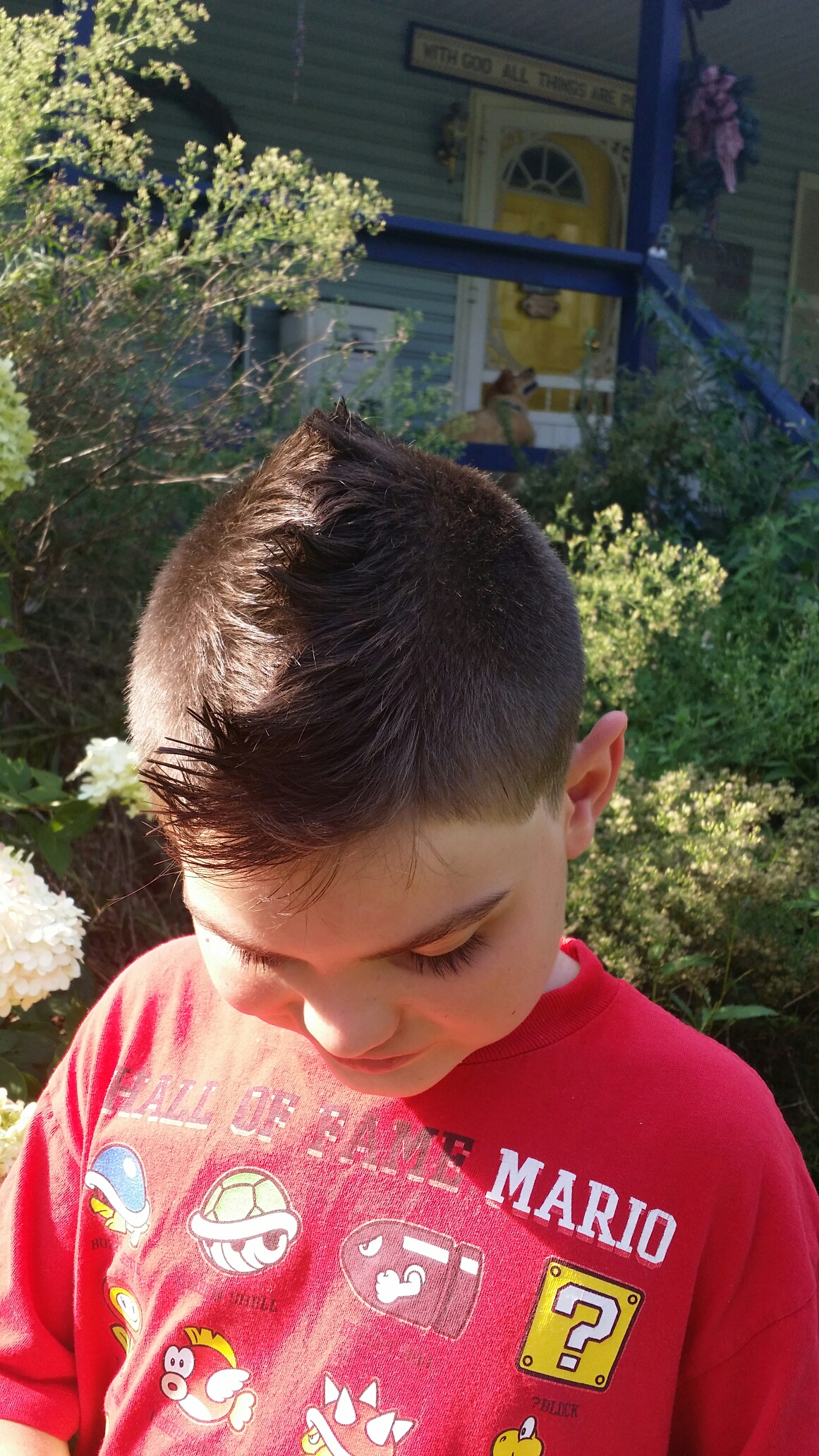 Jake is going to school full time for the first time ever. He’s really been enjoying it! He saw a haircut on another boy at school and decided he wanted his hair like that, too, so when he went to see Morgan after school at work, she cut it that way for him.