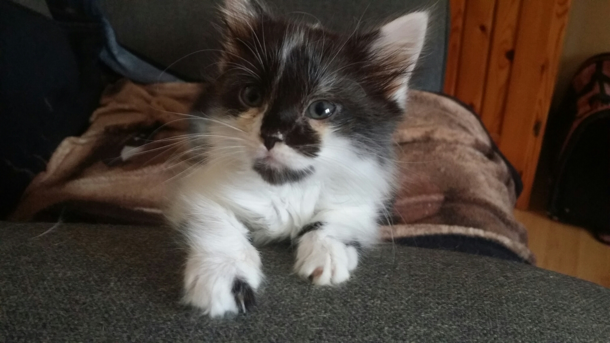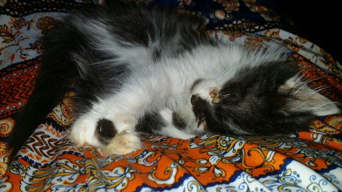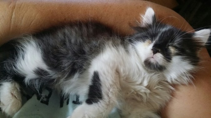 She’s the most laid back kitten I’ve ever seen. All she wants to do is sleep on me.