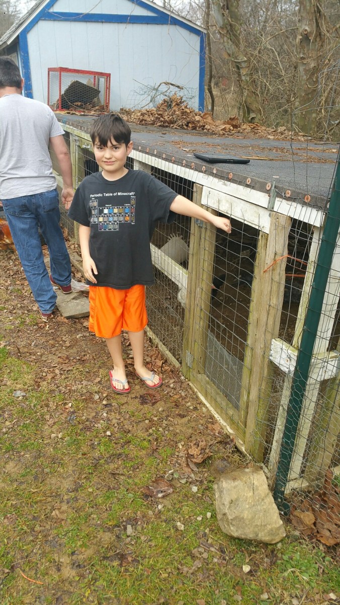 Of course, all the roosters had to come calling.  We have them kept apart for now as they’re just too big and could hurt these young pullets.  Also, as an aside, for people who say roosters will all fight to the death and can’t be kept together and who use that reasoning to justify cock fighting, IT’S A LIE!  These nine roosters may have a little jumping around tail pulling spat every once in a while, but they have a pecking order and never draw blood even when they do chase each other around.  They sleep on the same roost at night, eat and drink from the same places, etc.