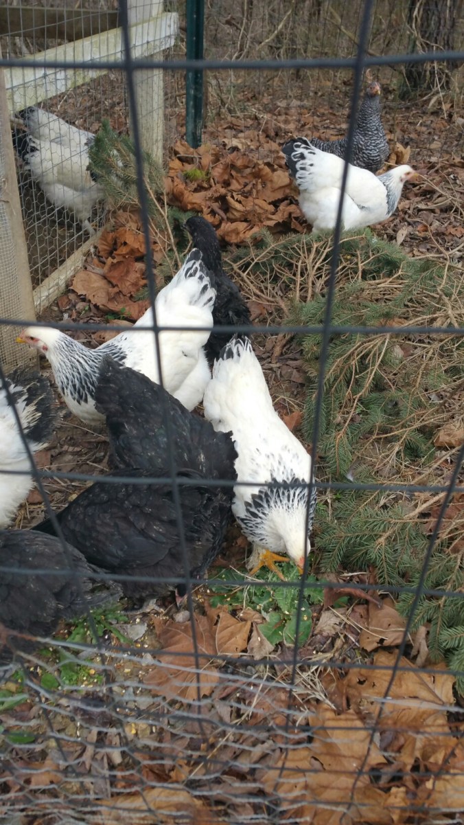 Right now, all our hens (old and new) are sleeping together in the coop!  They’re all cooing and sound so happy with their little snores!