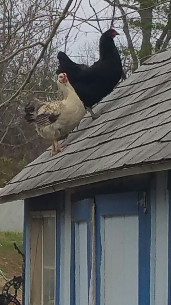 These two older hens cracked me up.  They climbed the coop roof to get a good look at the new ladies. LOL