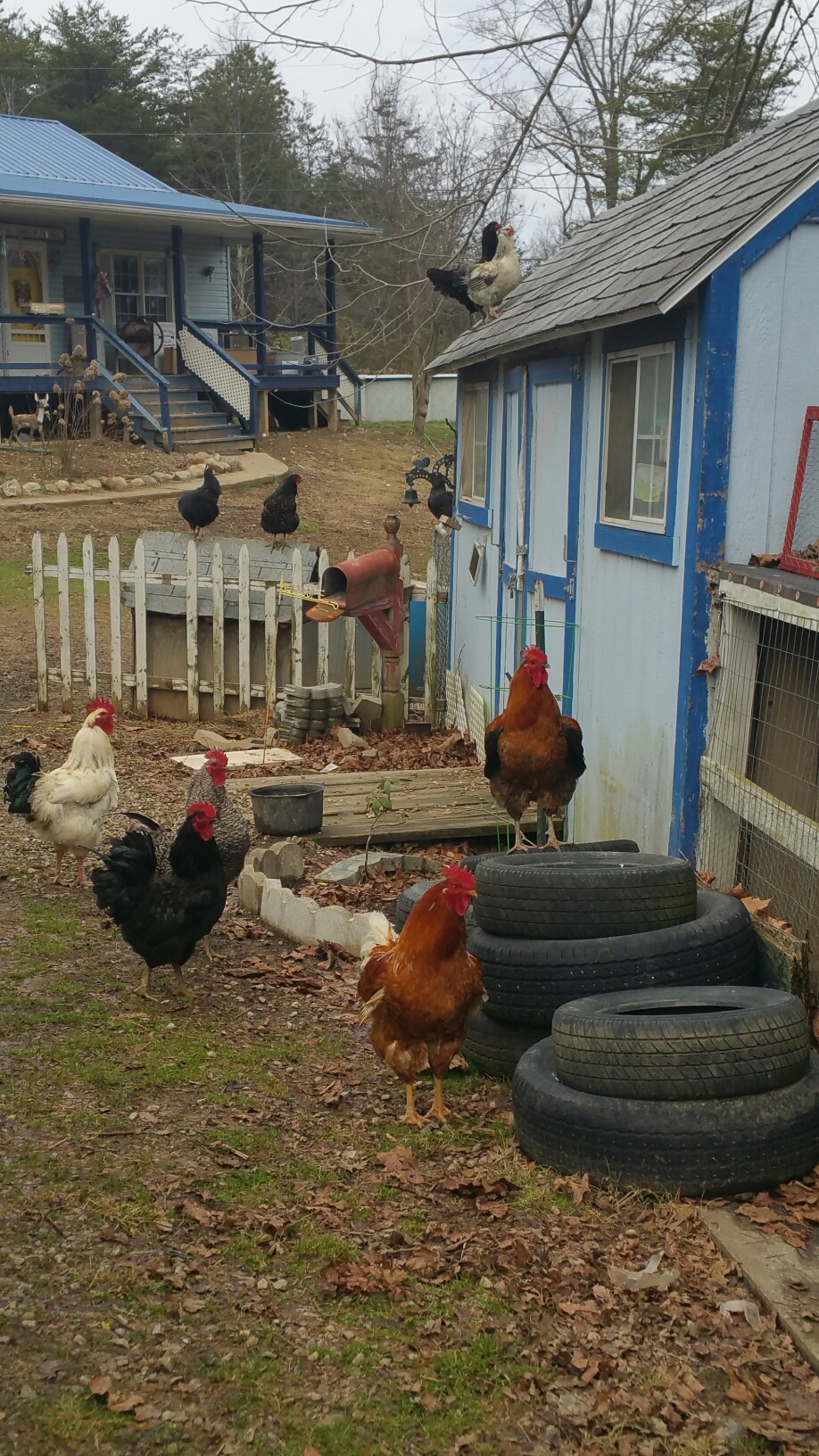 These two older hens cracked me up.  They climbed the coop roof to get a good look at the new ladies. LOL
