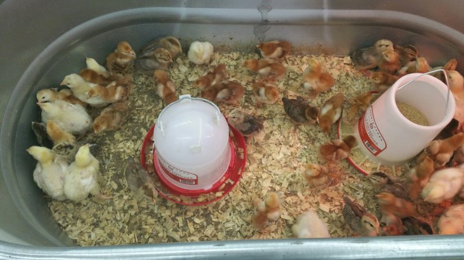 Ted fixed up the spot in the broody house to keep them safe from predators like raccoons and snakes, and they are growing like little weeds in there! They were just fine while we were in Chicago. He made sure they had a huge waterer, a huge feeder, lots of bedding, and a small heat lamp to keep warm, and they are all healed and perky now!
