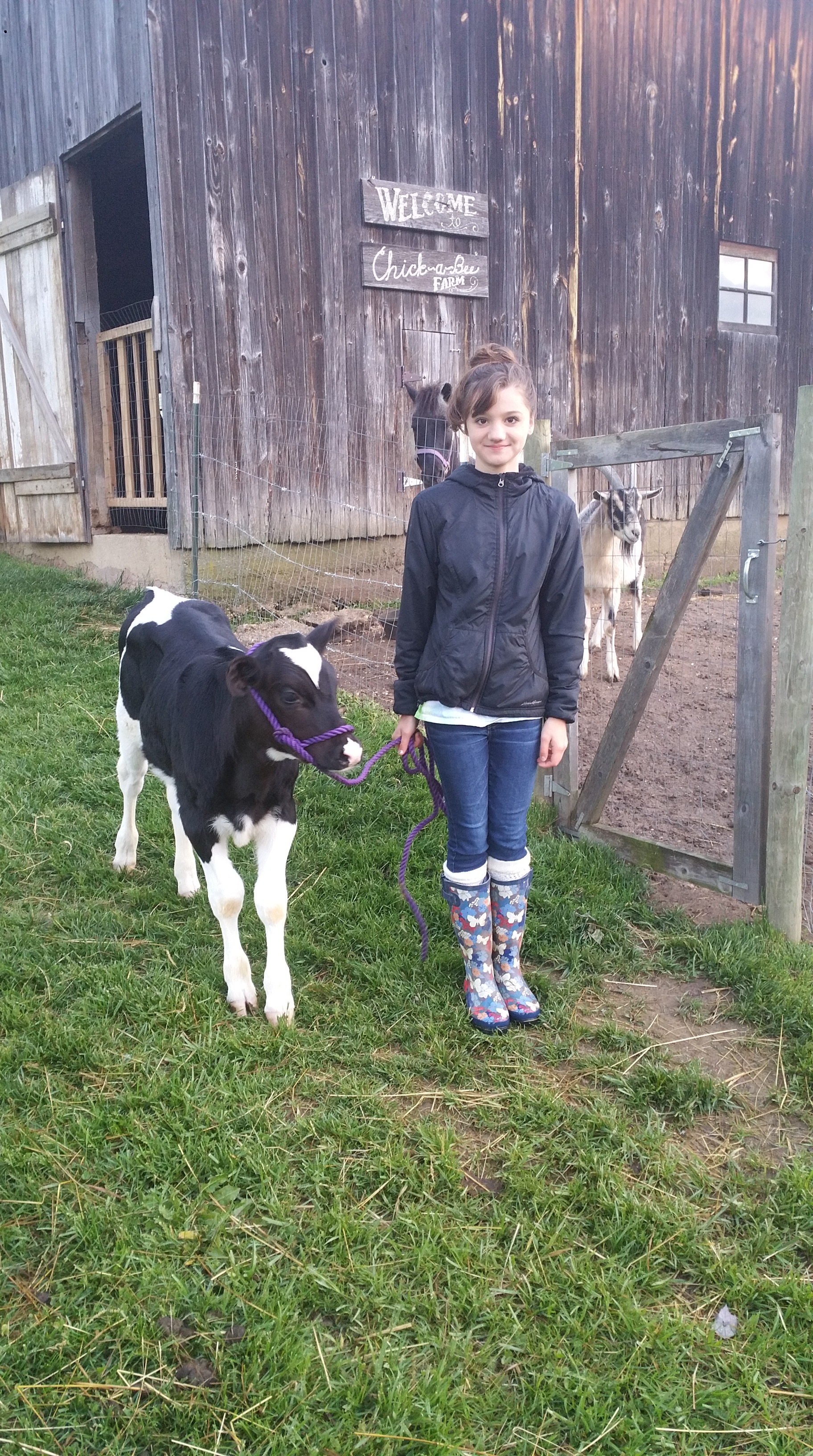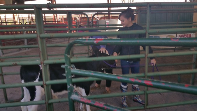 When we got to the fairground, we watched the four trailers in front of us unload their calves. We probably saw about fourteen go through before us (multiple calves per trailer). I am convinced Ivy has the best behaved and most tame calf of all of them. Klaus stepped on and off our trailer with ease both tines, walked through the gates and into the headgate with ease – and he did just fine. Other calves were being pushed and pulled around to get them where needed. The only time Klaus was pushed was when the workers failed to catch him in the headgate as he followed Ivy right on through; they pushed him backward into it before she had the chance to turn around.