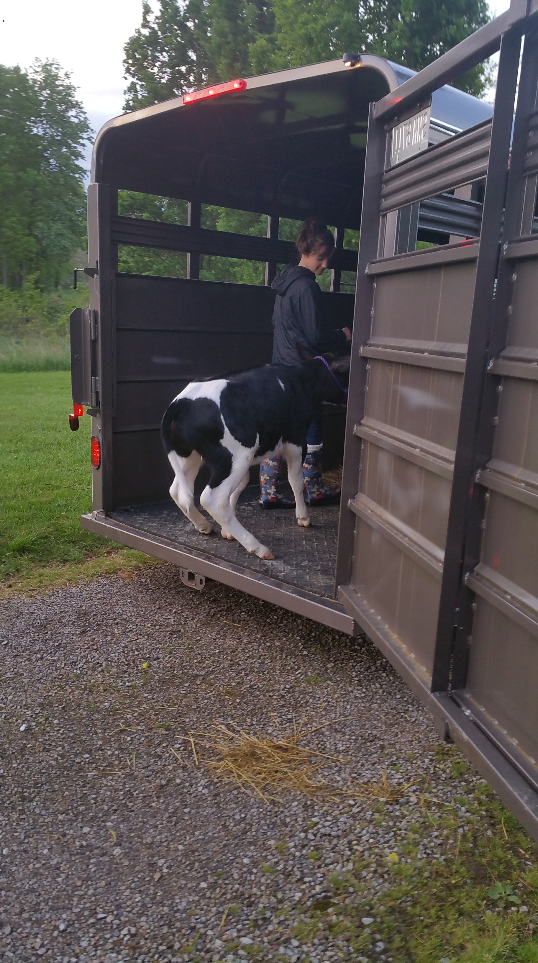 My friend, Erin, has a daughter in 4H who is taking a calf to the fair this year for the first time ever. Erin brought Klaus home in the backseat of her minivan, but he’s too big for that now so she needed some help hauling him to a weigh-in and vet vheck. I volunteered Red and traded the use of the trailer for soap (Erin makes the best soap!).