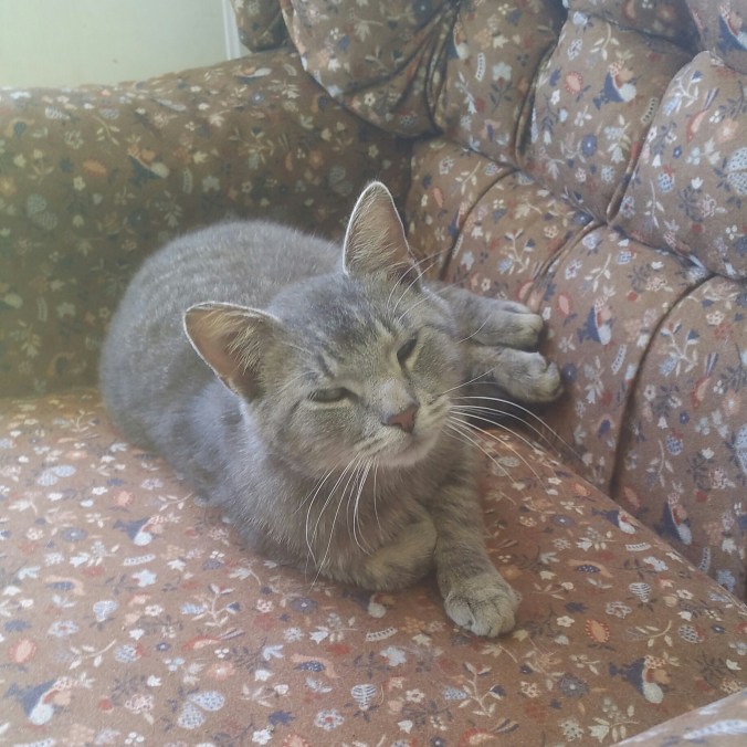 Now his favorite activity is curling up in a big patch of warm sunshine on the porch railing or in the big armchair on the porch, keeping an ear tuned toward the front door, listening for the click of the doorknob…