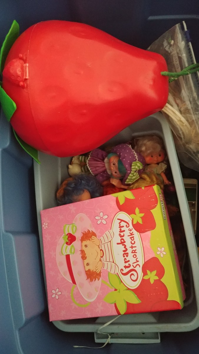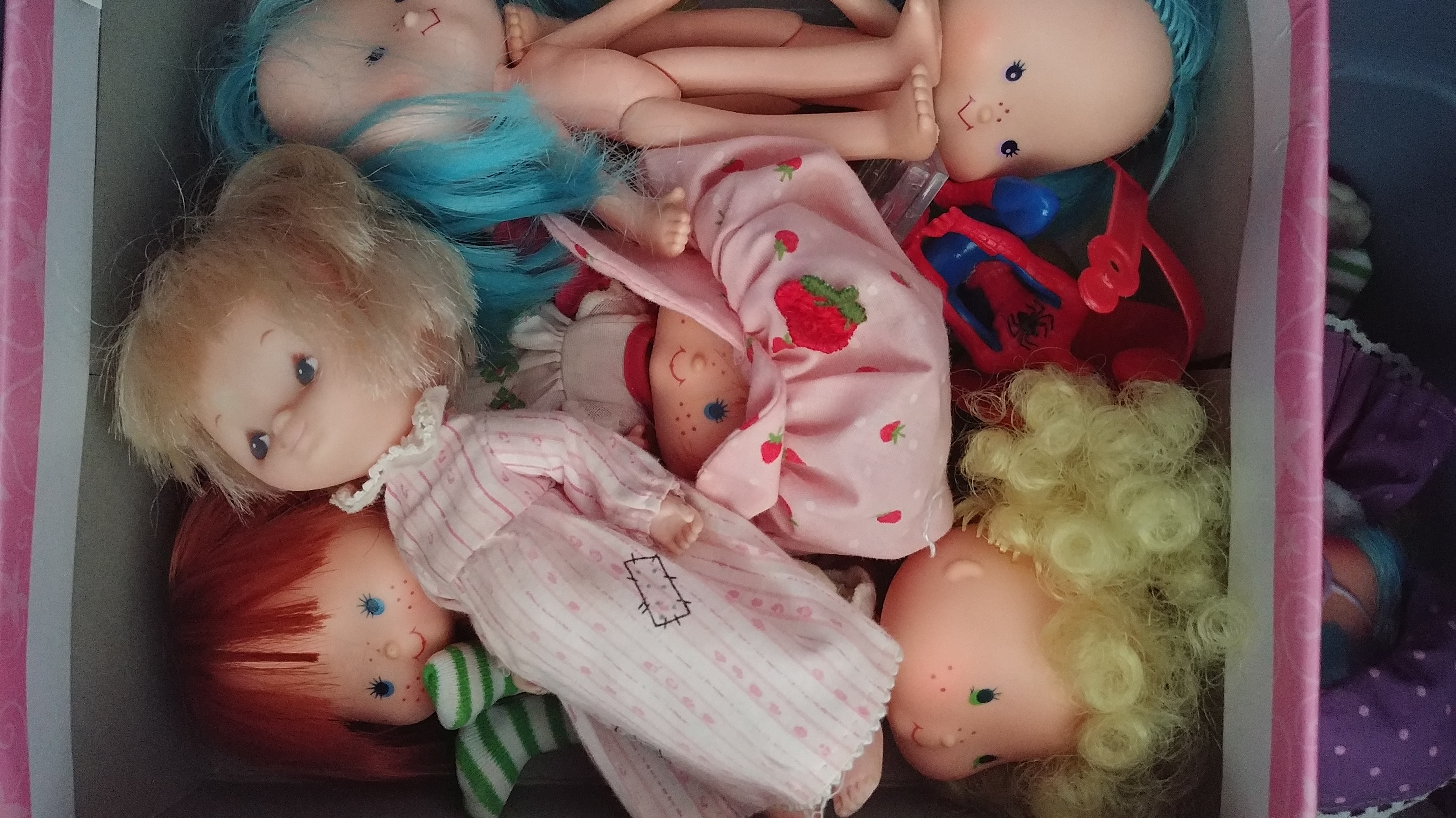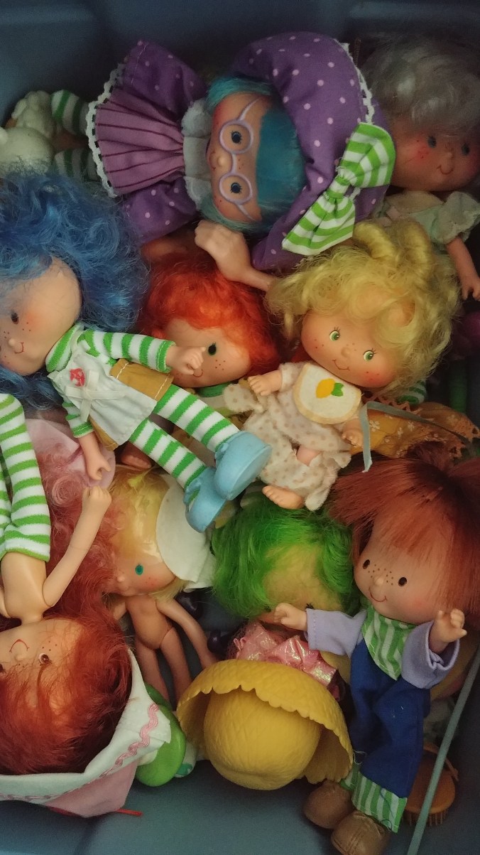 All of my old friends from childhood were staring up at me with their happy little smiles and their sweet eyes. I was an absolute Strawberry Shortcake fanatic when I was a little girl, and these are my old dolls that I played with for many many years, and then my kids played with them for many many years, and I had tucked them away in this bin for my grandchildren to one day play with for many many years.