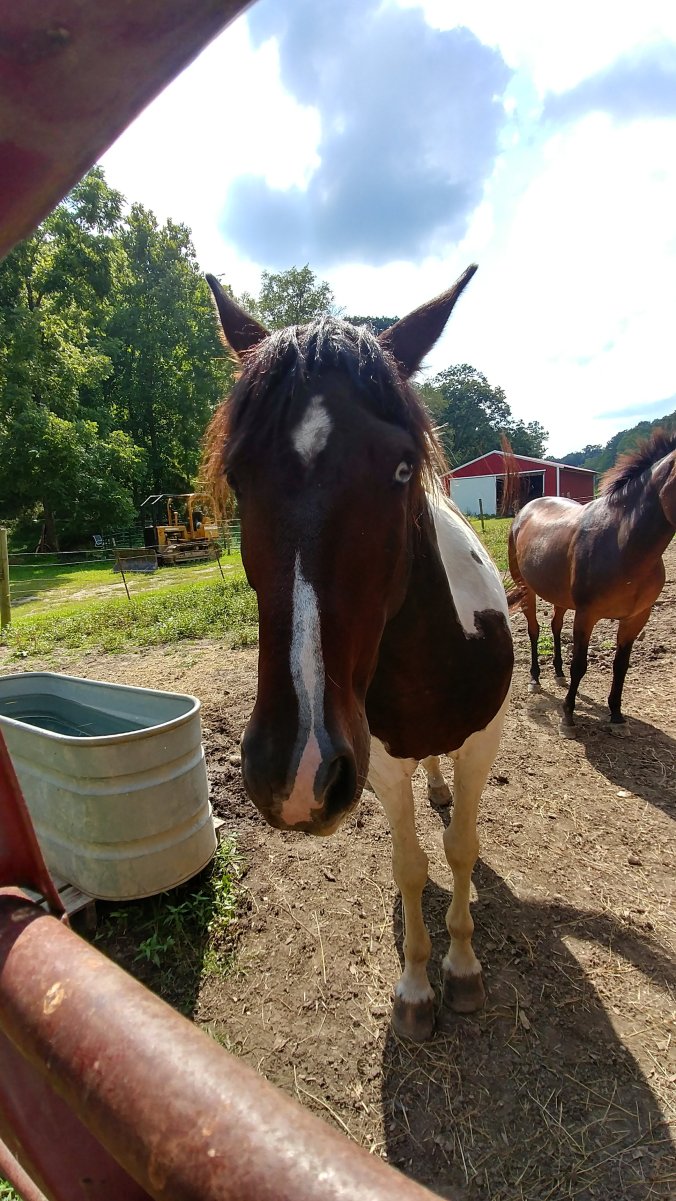 Jake was impressed that there was a horse…until the stall door opened, spilling out two large horses and a rather tall mule, all of which were very curious about what the three new people were doing in the barnyard. Then he wanted nothing to do with any of them because he was sure they were going to step on his feet.