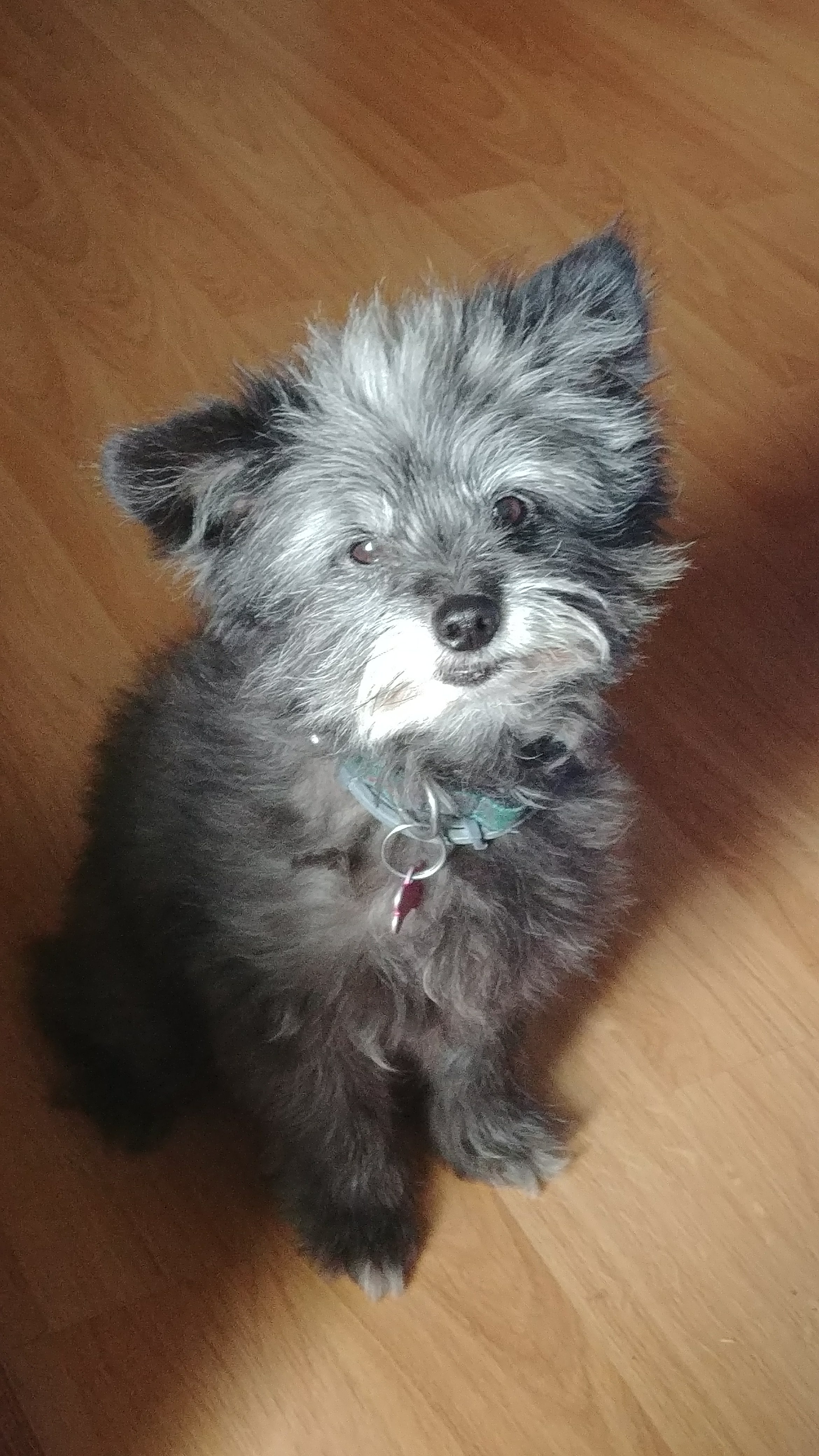 I love this little dog! I got Smidge at the flea market ten and a half years ago. She was just a little, solid black, fuzzy, tiny slip of a pup, and she fit in the palm of my hand. I carried her around in the pocket of my robe for weeks. I used to push Jake’s stroller around with Smidge hiding out in the bottom basket; she’s always loved to people watch! She greets me every single morning even though she sleeps in Jake’s room at the foot of his bed (a habit she started the night Cooper died, taking Cooper’s spot to comfort an inconsolable little boy).